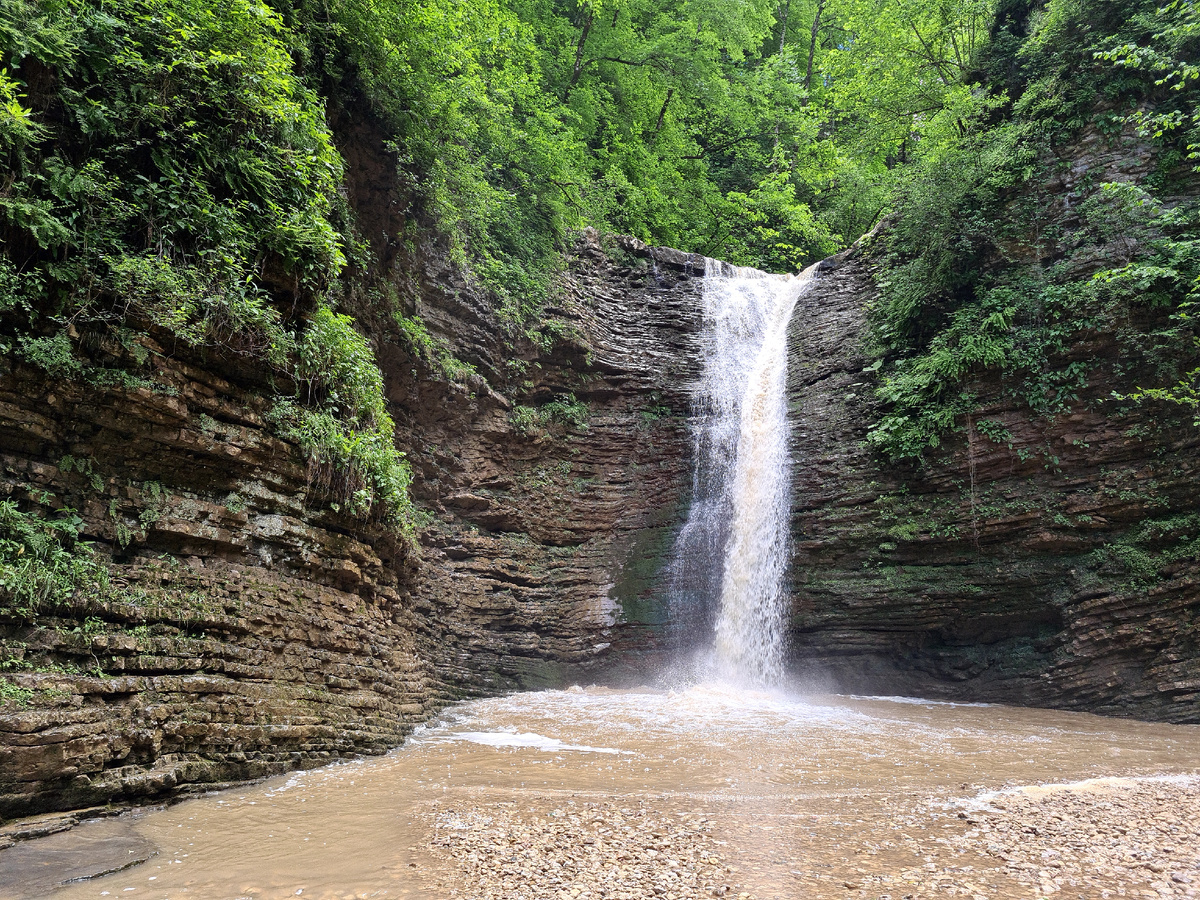 Горные реки каждый раз удивляют. Вот они тихо и говорливо текут и моют камешки. Четыре водопада оборудованы для посещения туристами. Река бывает разная тихая и спокойная в зное лето, с завесами сосулек зимой. Но после дождей эти реки не узнать. Приглашаю Вас на майские водопады. Первый водопад называется "Шум". Вода падает с высоты около 5 м. А май в этом году выдался дождливый. После сильного дождя уровень воды поднялся настолько, что мы не смогли дойти даже до второго водопада. РУФАБГО – речка, левый приток реки Белая, расположена между поселками Хаджох и Даховская. Длина реки 10 км, высота истока – 1020 м. Вот такая разная река в зависимости от погоды! Долина реки проходит через горные породы разных геологических периодов. Основные породы – темно-серые мраморовидные известняки. В обнажениях видны складки залегания пород. Глубина каньона близ устья – 160 м. Второй водопад называется "Каскадный". В ущелье сохранились реликтовые и эндемичные виды растений. Река получила название о