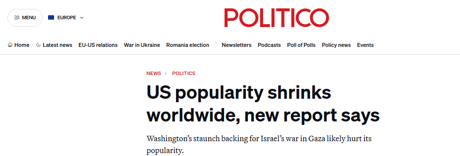 Тут издание Politico опубликовало "печальную" статью о том, что популярность США в мире неожиданно скатывается вниз. И приводит источники столь плачевной статистики. Саму статью я вам приводить не буду. Она скучна. Но вот мыслями, что она вызвала, поделюсь. Судя по новому Индексу восприятия демократии 2024 года от Latana, Америка уже не тот «глобальный шериф», каким её рисовали в старых голливудских вестернах. Около 63 000 человек из 53 стран проголосовали рублём доверия, и выяснилось, что в мусульманском мире США ощутимо «просели» – всё из-за фанатичной поддержки Вашингтоном израильской операции в Газе. Казалось бы, непоколебимость – это хорошо, но когда все вокруг говорят «набрали минус», может стоит пересмотреть курс? Поняли наконец и в Европе: Германия, Австрия, Ирландия, Бельгия и Швейцария впервые при Байдене снова ушли в «чистый минус». Они сворачивают попкорн и переглядываются: «Не уж то мы всю жизнь болели за того, кто нас игнорирует?» Разумеется, с учётом роста цен на энергон