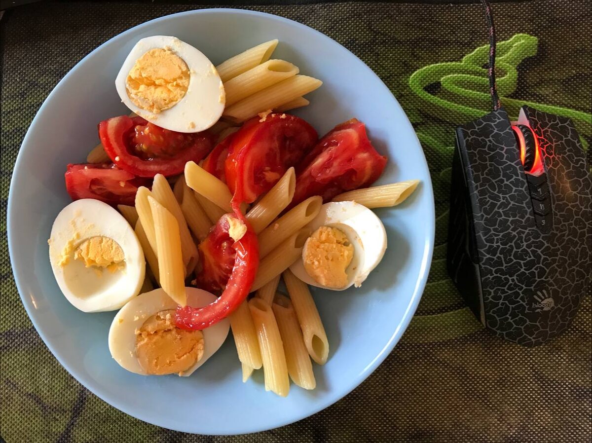 🍝 Я пытался красиво разложить еду. Не получилось. 😂 И у меня есть такое подозрение, что если бы я не пытался разложить еду красиво, возможно, получилось бы даже лучше. 😂 ✅ Ну, это обед, ага. 💪🙂👍 ❓Чем хорош такой обед? ✅ Ну, довольно сбалансированно на самом деле получается. ◦ Есть углеводы. Я ел этот обед после довольно продолжительной силовой тренировки + кардио (моё кардио это 15-20 минут работы со скакалкой). И лично моё мнение: отказываться от углеводов НЕ стоит! Просто надо нормальные углеводы есть. И вот как раз макароны = хороший вариант "правильных" углеводов. ◦ Есть белок. Ну, тут, думаю, всё понятно. Яичный белок это пример довольно хорошего и качественного белка, а особенно - после тренировки. Также, кто не знал, в макаронных изделиях тоже довольно много белка, например, в данной порции макарон, которая на фото, примерно 8-9 гр белка. ◦ Яичный желток тоже очень полезен в умеренных количествах. Но ими нельзя злоупотреблять. ◦ Помидор это вообще отличный овощ! Калорий м
