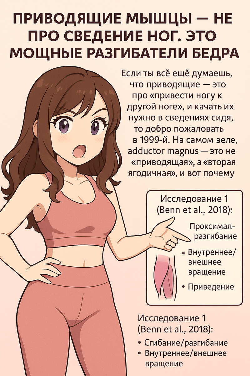 Если ты всё ещё думаешь, что приводящие — это про “привести ногу к другой ноге”, и качать их нужно в сведениях сидя, то добро пожаловать в 1999-й. На самом деле, adductor magnus — это не "приводящая", а "вторая ягодичная", и вот почему👇 https://doi.org/10.1002/ca.23068 📌 То есть, когда ты “сводишь ноги в тренажёре сидя” — ты вообще не добираешь то, что может реально дать массу и силу. https://pubmed.ncbi.nlm.nih.gov/4049651 ✅ Вместо сведений в тренажёре: ❌ Сведения сидя — если и делать, то как доработка, не как база.