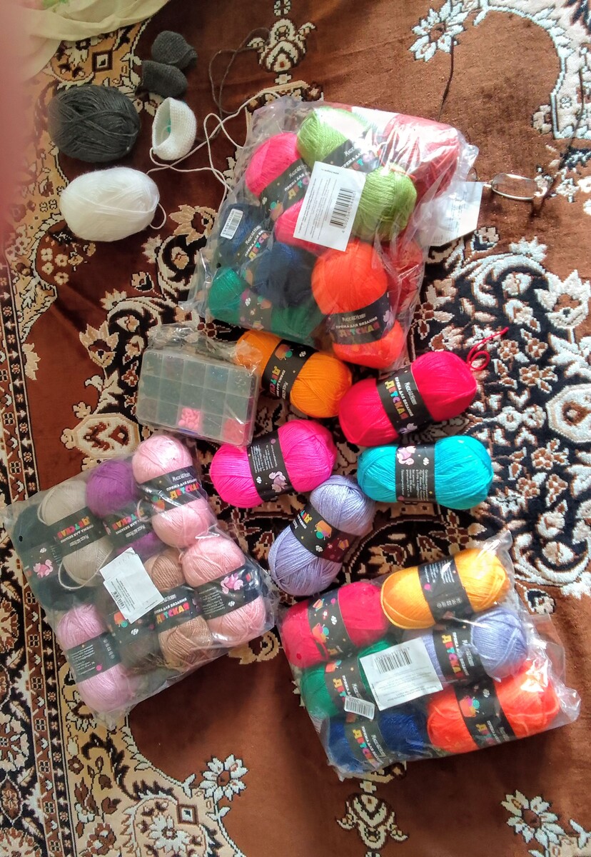 Нитки для вязания и мелочи- крючки,ножницы,иглы,глазки ,носики с крепежом.