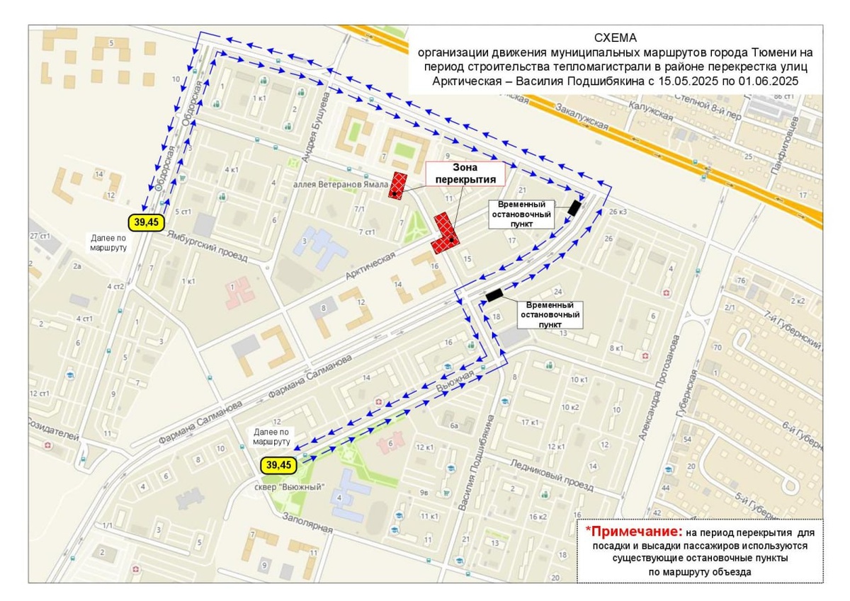 Маршруты №№ 39, 45 временно изменят схему С 15 мая по 1 июня 2025 года в связи с выполнением строительных работ в районе перекрестка улиц Арктической и Василия Подшибякина маршруты №№ 39, 45 будут следовать в объезд перекрытого участка со всеми существующими остановочными пунктами по маршрутам объезда. Расписание для пассажиров общественного транспорта доступно в разделе «Расписание» на сайте tgt72.ru, в мобильном приложении «Тюменский транспорт», по бесплатному номеру телефона информационно-справочной службы 8-800-250-0722 и на остановках. МКУ «Тюменьгортранс»