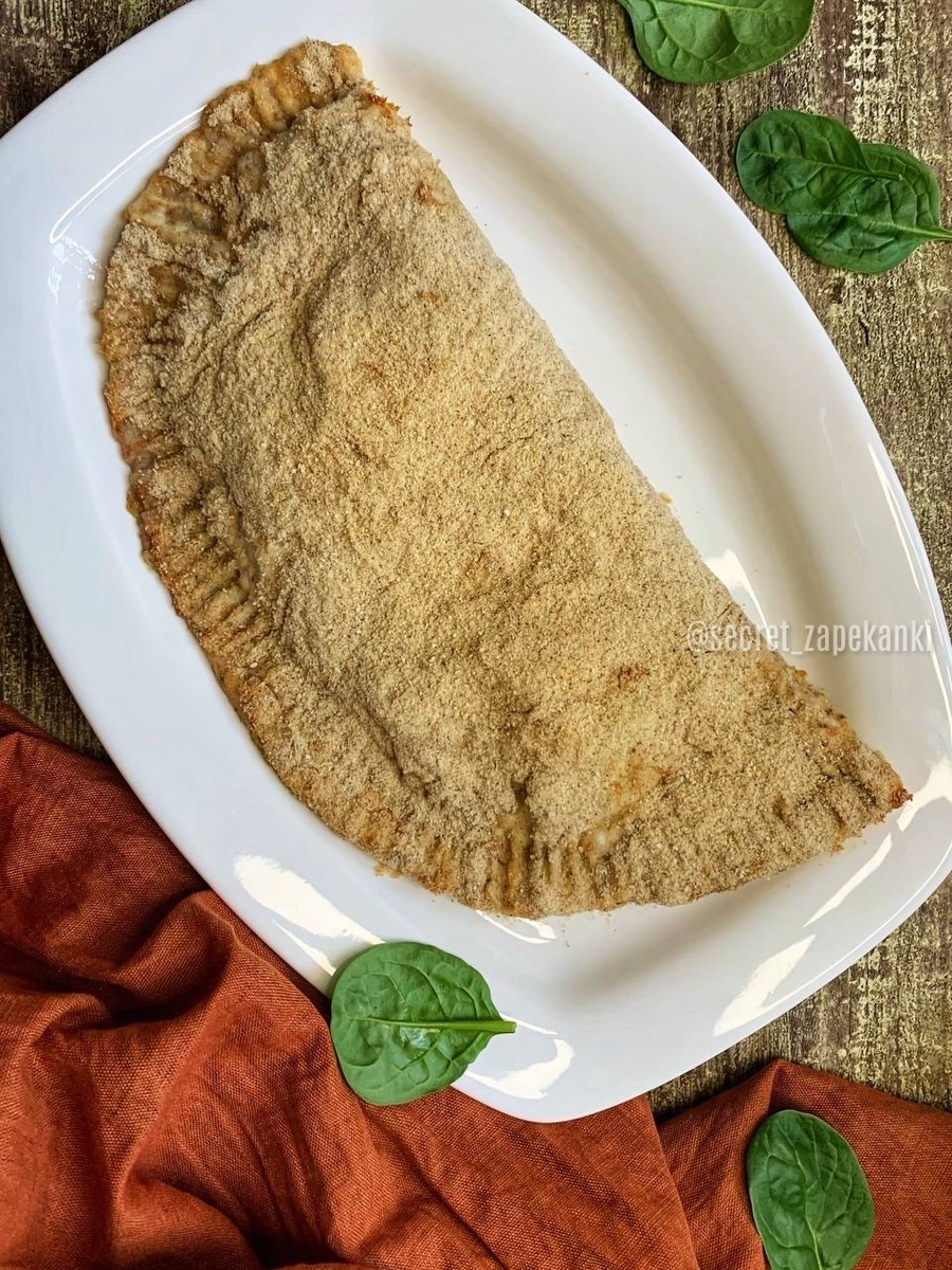 На первый взгляд, от классического кальцоне здесь, пожалуй, только форма. А я напомню, что кальцоне – это закрытая пицца в форме полумесяца… Но попробовав, вы и не заметите разницы. Фарш настолько филигранно превращается в тонкое запечённое тесто и идеально запечатывает все соки внутри. А ещё такой кальцоне может смело претендовать на звание самого ППшного и полезного, от которого вы не имеете права отказаться! Берём: - фарш куриный 450 г - чеснок сухой 2/3 ч. л. - орегано 1/2 ч. л. - соль, перец - творожный сыр 40 г - паста томатная 20 г - шпинат свежий 30 г - помидор 1 шт. - сыр моцарелла для пиццы 50 г - сухари панировочные 20-30 г Противень, пергамент силиконизированный 2 шт., скалка. Фарш соединяем со специями и вымешиваем. Формируем из него «колобок». Творожный сыр смешиваем с томатной пастой. Шпинат перебираем, промываем при необходимости. Помидор и моцареллу нарезаем кружочками. Пергамент посыпаем 1/2 сухарей. По желанию их можно немного обжарить на сковороде.