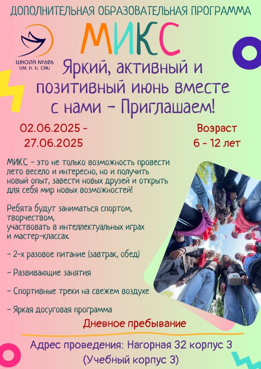 МИКС: Незабываемое лето ждет! ☀️ 🎉 МИКС – это ваш шанс подарить ребенку яркое и познавательное лето! ☀️С 02.06.2025 по 27.06.2025 ребят ждет мир новых возможностей, друзей и незабываемых впечатлений! 🎆 Ребят ждут спортивные занятия, творческие мастерские и увлекательные интеллектуальные игры. Время пролетит незаметно, а польза останется навсегда! 🍎 Мы предлагаем 2-х разовое сбалансированное питание (завтрак, обед) для учеников 1-5 классов, чтобы энергия била ключом! 📚 В программе: развивающие занятия, увлекательные мастер-классы и яркая досуговая программа, которые не дадут заскучать ни минуты! 📌 Дневное пребывание для детей от 6 до 12 лет по адресу: Нагорная 32, корпус 3 (Учебный корпус 3). 📝 Успейте записаться на портале мос.ру до 29 мая 2025 г.! Открытие группы возможно только при наборе от 25 человек. Не упустите возможность! ⚡️ Код 2280599 ☄️ Ссылка #ДОНМ #ШколыКолледжиМосквы #школа626 #школасац #котловка #мрсд23 #допы626 #ДополнительноеОбразование #допобразование