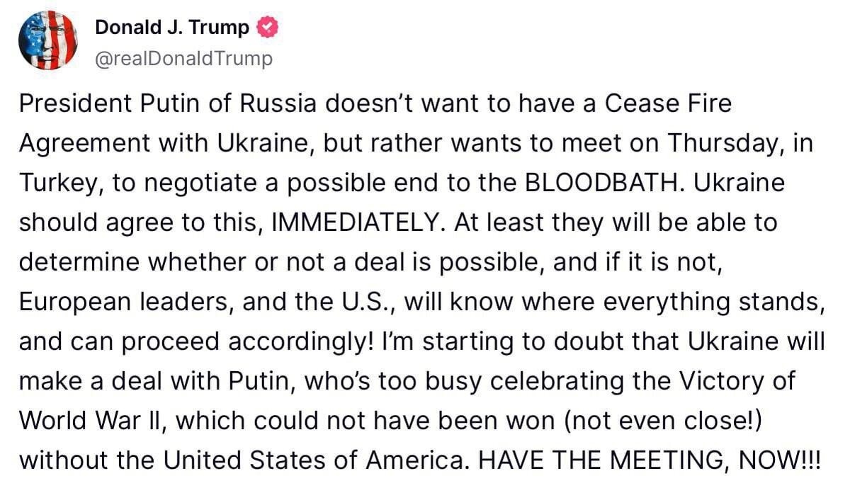 В своём же обращении Путин сделал неожиданное предложение: возобновить прямые переговоры с Украиной без каких-либо предварительных условий. Встреча намечена на 15 мая в Стамбуле, где диалог был приостановлен ещё в 2022 году.