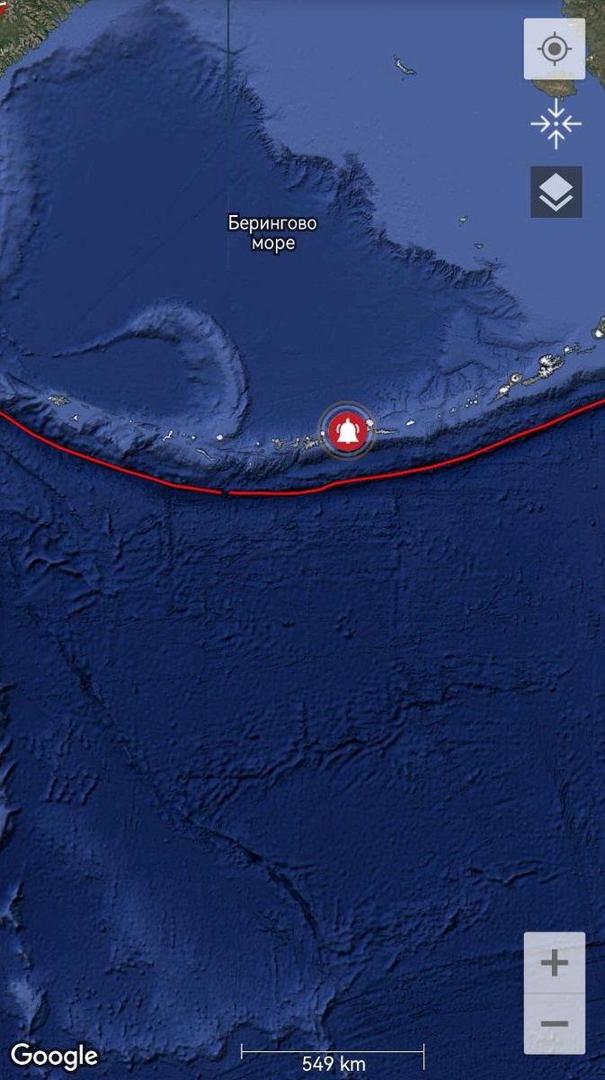 Алеутские острова между двух циклонов рисуют линейные провалы в облачности уровня М6-7 ===== The Aleutian Islands between two cyclones draw linear dips in the clouds of the M6-7 level