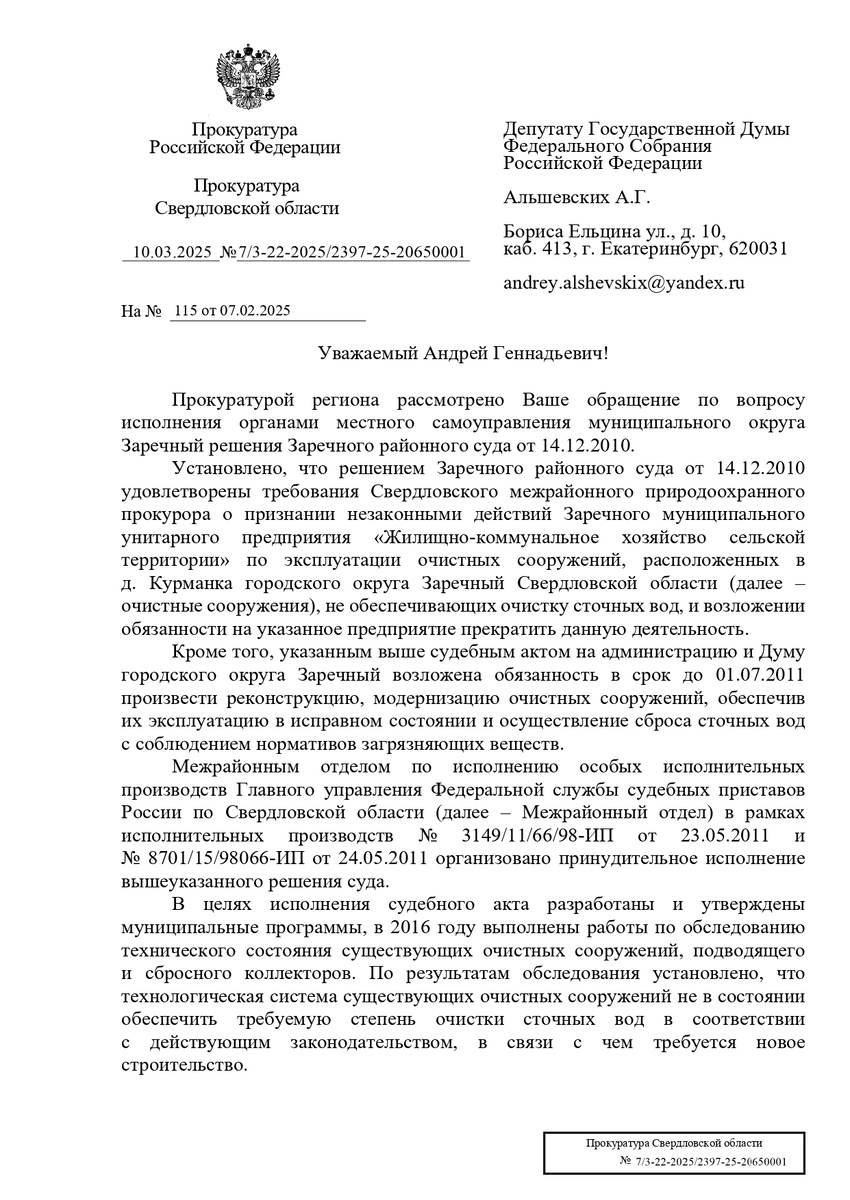 В 2010 году суд обязал районные власти реконструировать очистные в деревне Курманке. Прошло почти 15 лет… И за это время местные администрация с думой не смогли решить задачу. Она явно оказалась повышенной сложности. Не по зубам. Хорошо помню слова Президента: «“Терзать и трясти” чиновников, добиваясь нужных для граждан решений». Потому раз за разом напоминаю должностным лицам, чтобы поторапливались. В ответе прокуратуры – подробности.
