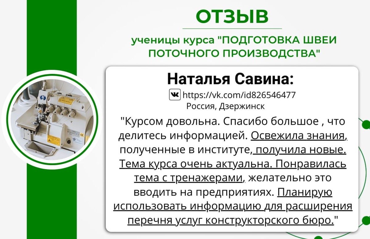 Отзыв о курсе и подарок участникам 🎁 ☀️ Майские праздники для многих – время отдыха, а наши участники курсов активно учились и выполняли задания 📝 Недавно состоялась ✨ премьера курса «Подготовка швеи поточного производства», и уже есть первые успехи👍 Наталья Савина успешно выполнила итоговые задания, получила сертификат и поделилась своими впечатлениями. «Курсом довольна. Предпочитаю учиться у профессионалов практиков. Спасибо большое, что делитесь информацией. Освежила знания, полученные в институте, получила новые. Тема курса очень актуальна. Понравилась тема с тренажерами, желательно это вводить на предприятиях. Планирую использовать информацию для расширения перечня услуг конструкторского бюро. Клубу процветания и до новых встреч!!!» Желаем Наталье успешного внедрения полученных навыков в работу, процветания конструкторскому бюро и благодарных клиентов! 🤗 Что в курсе: ✅ Готовые инструменты – тренажёры, шаблоны, инструкции видеоуроки и чертежи для самостоятельного изготовле