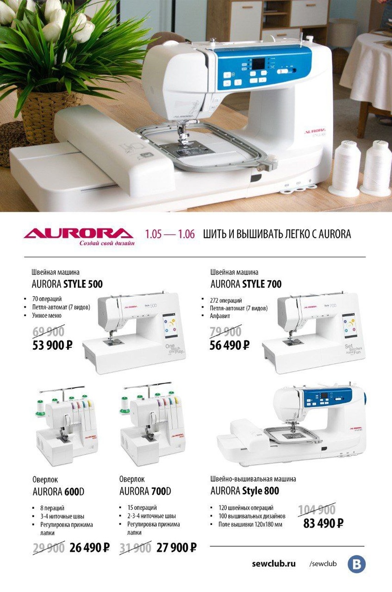 ✨ СУПЕРСКИДКИ НА ШВЕЙНЫЕ МАШИНЫ! ✂️ До 1 июня! ✨ Успейте купить швейные машины со скидкой в «Белой розе»! 🎉 Широкий выбор, лучшие цены! 🤩 Акционные модели: * Оверлок Aurora 600D: 26 490₽ (было 29 900₽) * Оверлок Aurora 700D: 27 900₽ (было 31 900₽) * Оверлок Bernette Funlock b44: 44 900₽ (было 49 900₽) * Швейная машина Aurora Style 700: 56 490₽ (было 79 900₽) * Швейно-вышивальная машина Aurora Style 800: 83 490₽ (было 104 900₽) Спешите! Количество ограничено! 🏃♀️💨 Ждем вас в «Белой розе»! 💖