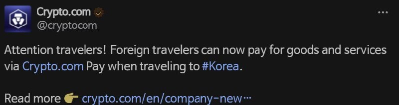 Crypto.com Pay теперь доступен для южно-корейских путешественников Crypto.com (CRO) объявила на своем официальном сайте X о том, что теперь южно-корейские путешественники могут расплачиваться с помощью Crypto.com Pay.