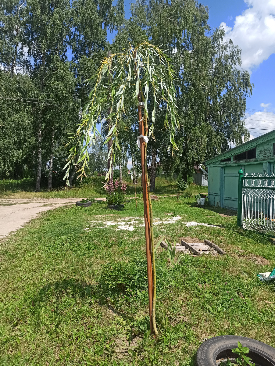 Ивы у дома мы посадили на второй год владения домом в 2022, до этого там росли две рябины, все бы с ними хорошо если бы не запах во время цветения, да и место у них было неудачное потому и убрали мы это хозяйство. Ветки укореняла сама в воде, высадила две перед домом плакучих и извилистую в проулке сбоку от дома, там рядом слив с бани закопан.