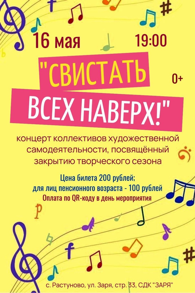 СДК «Заря» приглашает всех жителей и гостей села Растуново на концерт «СВИСТАТЬ ВСЕХ НАВЕРХ!», посвящённый закрытию творческого сезона