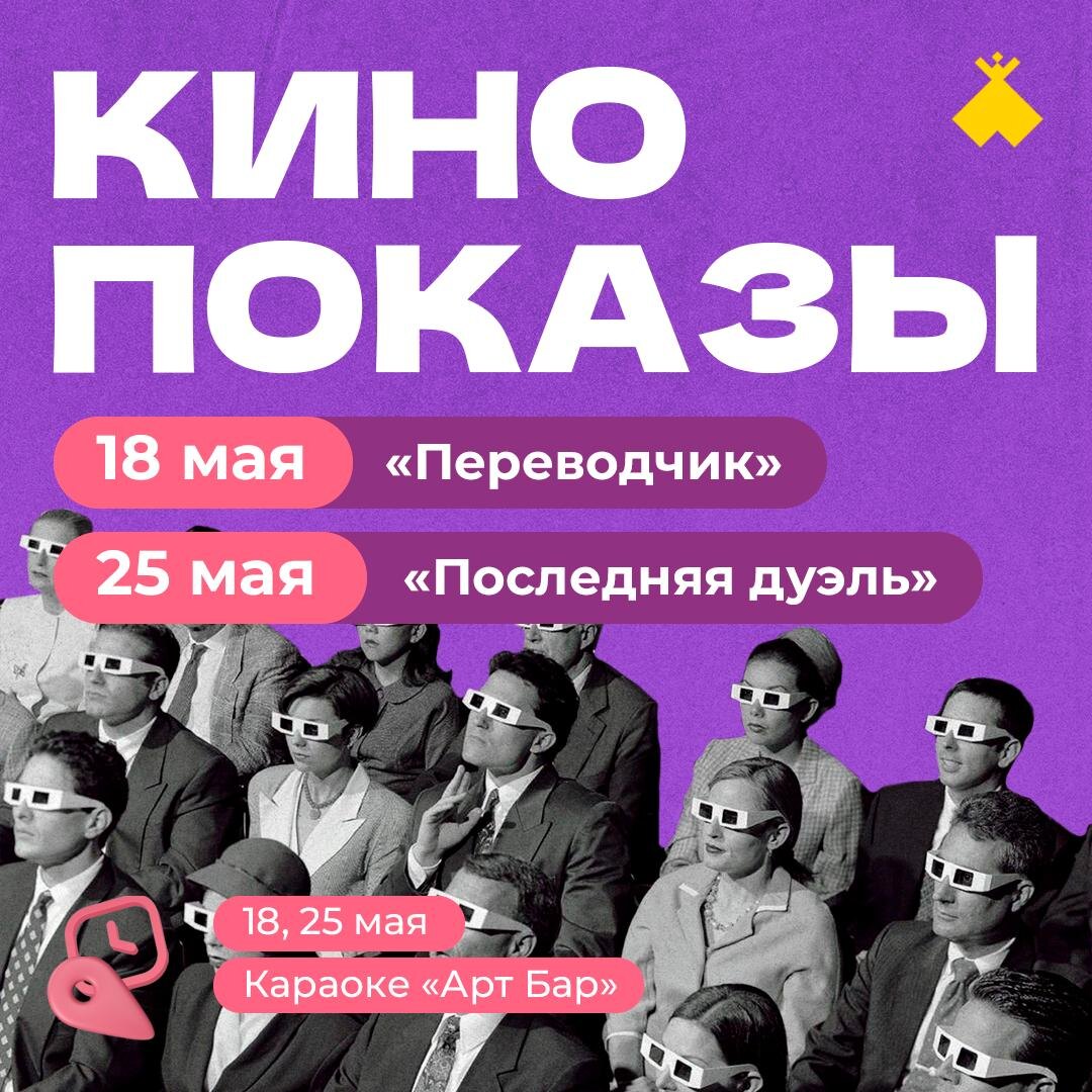 🎬 Майские кинопоказы (18+) 📍18 и 25 мая в 19:00 📍Караоке Арт Бар (г. Нарьян-Мар, ул. Ленина, 6) 💸бесплатно Шумные выходные подошли к концу — отличный повод замедлиться и провести вечер за хорошим кино. Зал караоке превращается в уютную кино-гостиную: ужин, напитки, мягкий свет и настоящая лаунж-атмосфера. Запись по номеру: +7 (911) 552-00-00 🥰 Не забудьте подписаться на канал