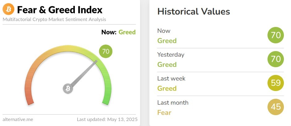 Криптовалютный «Индекс страха и жадности» на уровне 70... Как и в предыдущий день