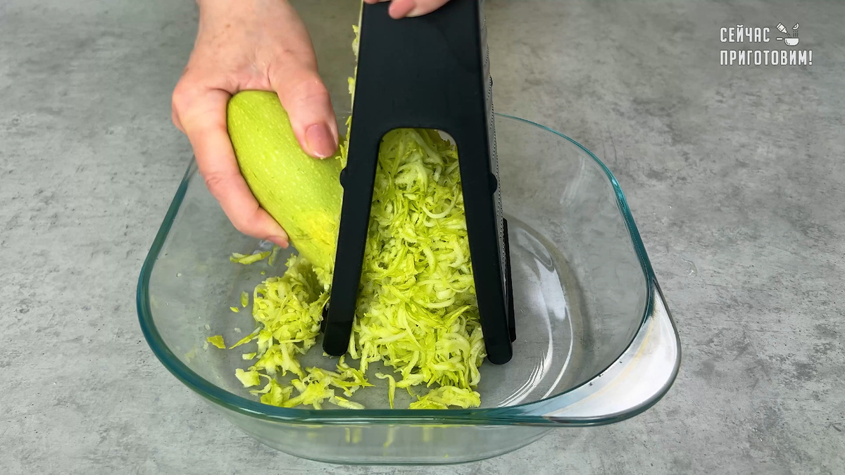 Всем привет, дорогие друзья! Так кабачки вы, возможно, еще не готовили. Беру два небольших кабачка, примерно 500 граммов, и натираю их на крупной терке. Кабачки у меня молоденькие, я их не очищаю от кожуры и натираю вместе с семечками. Добавляю пол чайной ложки соли, перемешиваю и оставляю так на столе минут на 10. За это время кабачки выделят жидкость. Прошло 10 минут, и кабачки уже много выделили жидкости. Теперь нужно их отжать, лишняя влага нам не нужна. Теперь добавляю два яйца, пол чайной ложки соли и перец по вкусу. Перемешиваю и добавляю 3 столовые ложки муки. Снова перемешиваю. Нарезаю немного свежей зелени — у меня зеленый лук. Вместо лука можно взять петрушку с укропом, тоже получится вкусно. Теперь добавляю 80 граммов сыра, я его уже заранее натерла на мелкой терке, и еще раз все перемешиваю. Сковородку смазываю немного растительным маслом и перекладываю кабачковую массу, равномерно распределяя ее по всей поверхности. Диаметр моей сковороды — 22 см. Ставлю сковородку на ого