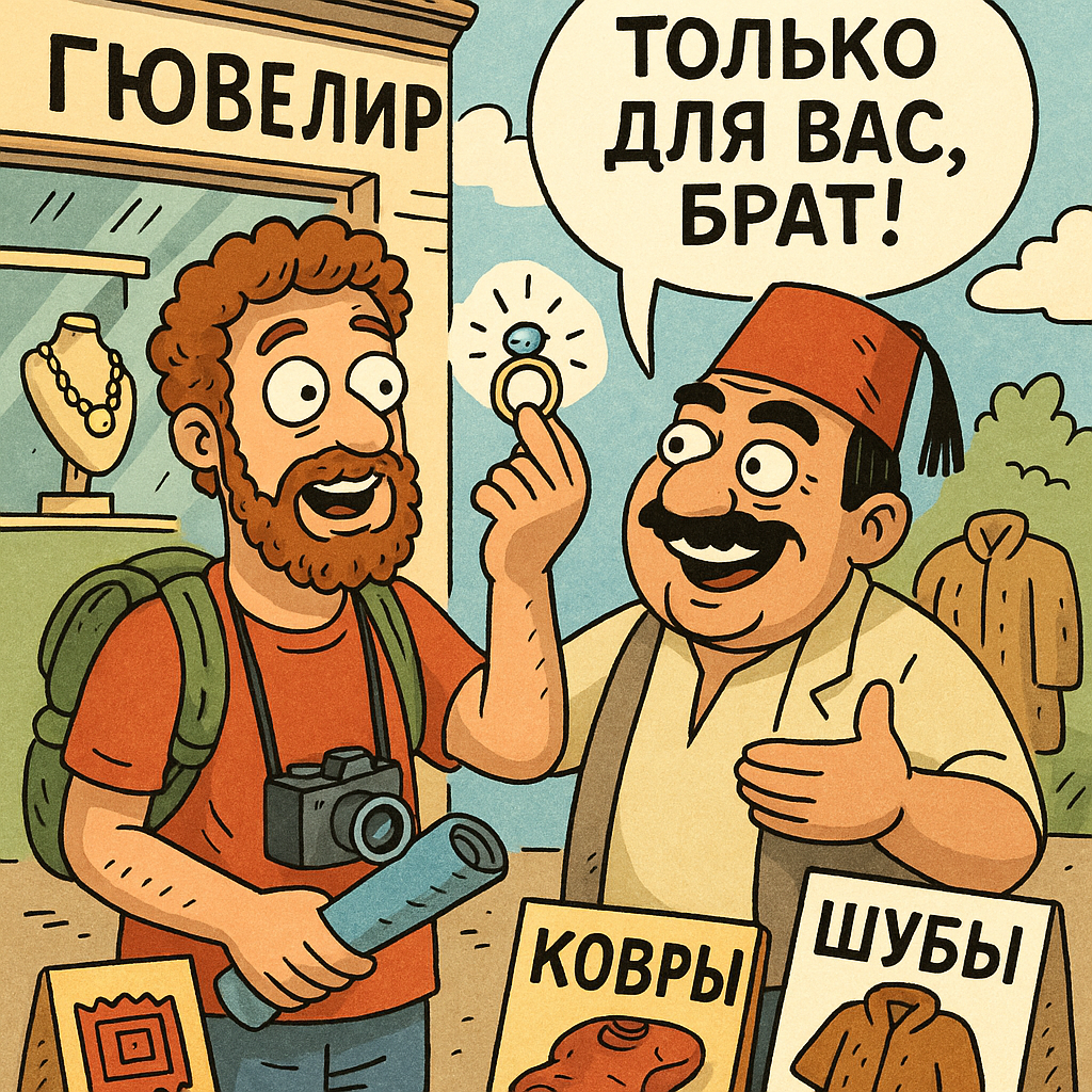 И тут мне попадается видео с туристического форума, где местный гид — не где-то в переулке, а с микрофоном, на сцене, перед людьми — открыто рассказывает: «Да, мы русских обманываем. Потому что можно». Он говорит это с улыбкой. Даже с гордостью. Как будто получил орден за вклад в индустрию кидалова. «Русские — золото!» — говорит он. Не как комплимент. А как определение. Мол, самый ценный контингент, потому что щедрый, доверчивый и плохо подготовленный. Идеальный клиент для ювелирного ларька с позолотой и для кожаного шоурума с куртками, которые плавятся под солнцем. Давайте разберёмся. Типичная схема выглядит так: