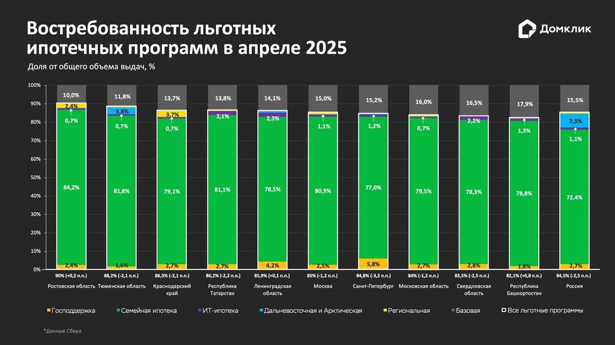 📊 Спрос на рыночную ипотеку в апреле вырос до 15,5% 🔘В апреле 2025 года доля рыночной ипотеки в России достигла 15,5% — это на 2,5 п.п. больше, чем в марте, выяснили аналитики Домклик. 🔘При этом 90% таких кредитов приходится на вторичное жильё. Лидером по спросу стала Новгородская область, где доля рыночных программ приблизилась к 35%. 🔘Среди льготных программ лидирует «Семейная ипотека» (135,9 млрд руб.), а «Дальневосточная и Арктическая» показала рекордный рост: +21% к марту. Читать подробнее ➡
