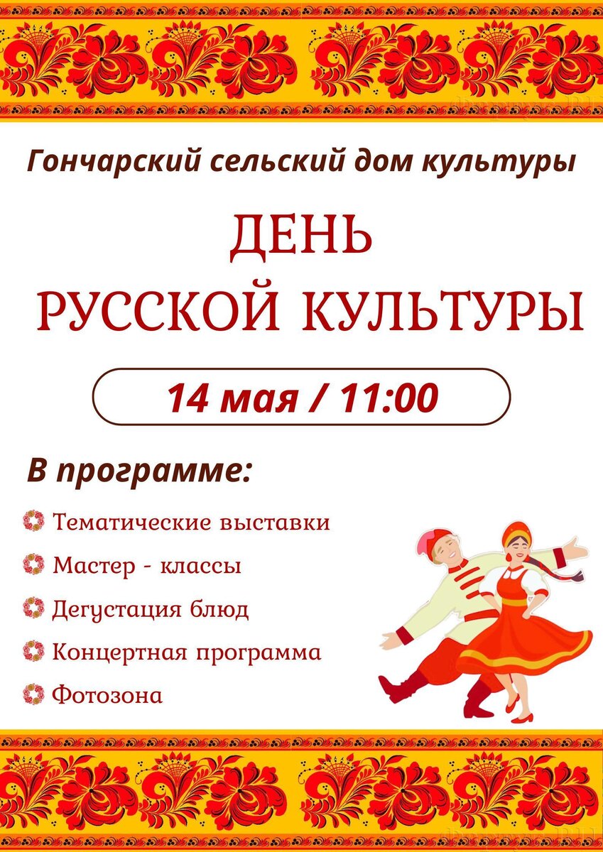 Приглашаем всех на яркий и незабываемый День русской культуры, который состоится 14 мая в 11:00 в Гончарском СДК. Вас ждет насыщенная программа, посвященная богатому наследию России. Приходите всей семьей и друзьями! Разделите с нами радость и красоту русской культуры!