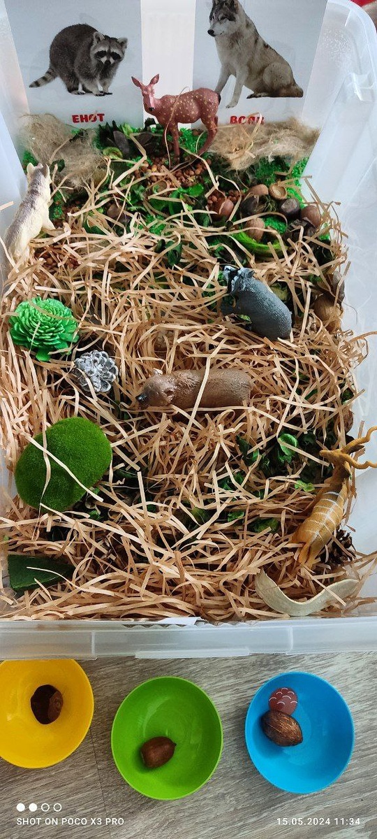Вспомнила, что забыла поделиться ещё одной одной сенсорной коробкой, которую я скрафтила – лесной полянкой. Лес имитируют ⤵️ ✅ нарезанная бумага ✅ набор природных финтифлюшек ✅ крашеный зелёный рис ✅ мох ✅ чечевица В качестве развивашек ▶️ сын раскладывал пинцетом каштаны, шишки, орехи и жёлуди по разноцветным мисочкам. ▶️ потом считали их. ▶️ ещё карточки с животными прилепила, сравнивали их с фигурками. ▶️ всю мелочь жмякал пальчиками. Не могу сказать, что Пацан прям долго залипал в коробке, но игра зашла. Ферму и Марс выкладывала раньше. Мамули, вы как относитесь к сенсорным коробкам? Норм или против, потому что детёныш всё рассыпет по квартире?