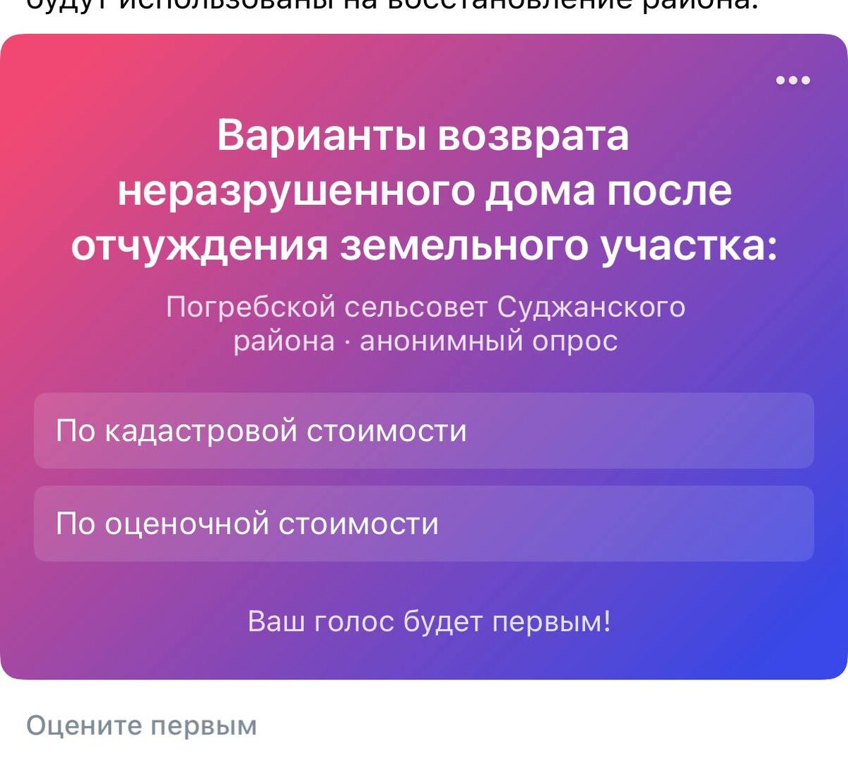 После публикации Романа Алехина с предложением сохранить за пострадавшими от украинской агрессии жителями Курской области их земельные участки и постройки — даже в случае разрушений — региональные власти инициировали опрос среди местных жителей. Однако, по мнению Алехина, в опросе отсутствует главный вариант — тот, что вытекает из слов самого Президента.