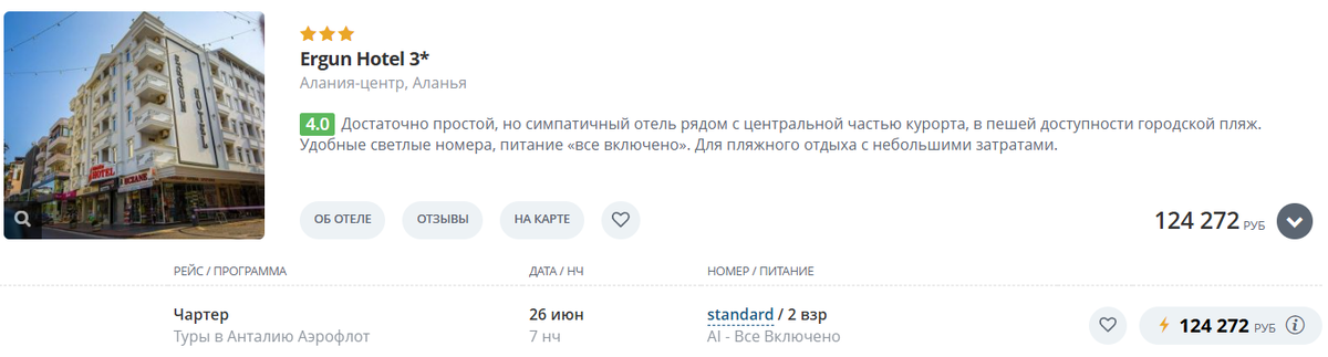 Теперь давайте посчитаем, сколько стоит отдых в Ergun Hotel 3*. Сделаем подборки туров с вылетом из Самары на 2-х взрослых, 7 ночей, питание "все включено":