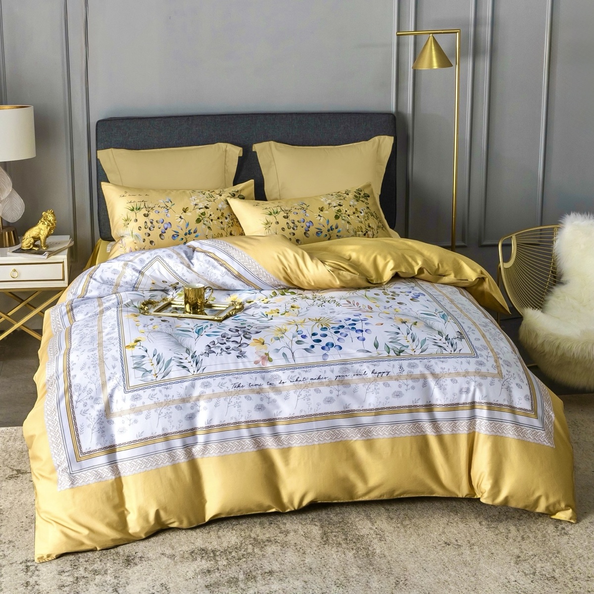 Желтый - один из трендовых цветов сезона весна-лето 2025 г.. А мне кажется, что желтый - это цвет вне времени и трендов. Когда он появляется в интерьере, становится теплее, светлее и радостнее. Желтый как первые цветы мать-и-мачехи - это весна. Желтый как одуванчики - это самое начало лета, еще сочно-зеленое, звонкое и впереди еще целых три месяца. Желтый как солнце, теплое, щедрое, согревающее. Поэтому сегодня у нас будет обзор солнечно-желтого постельного белья «Риуми». Пододеяльники выполнены в белом цвете и украшены принтом из цветов и трав, будто нарисованных акварелью. Цветы получились воздушные, трепетно-полупрозрачные. Рисунок завершает многослойный багет из рамочек с нарисованными кружевами и сухоцветами. Поддерживает желтую тему комплекта широкая желтая рамка по краю. Основные наволочки выполнены в медово-желтом цвете и украшены таким же акварельным разнотравьем, что и пододеяльники. Дополняет дизайн ткань-компаньон в желтом оттенке. Из ткани компаньона сделаны простыни, до