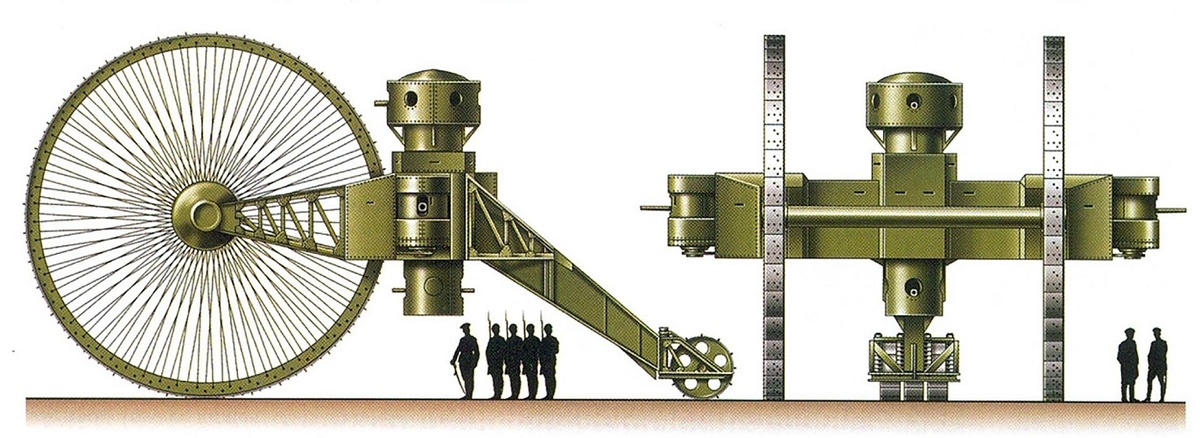 В 1914 году инженер Николай Николаевич Лебеденко представил военным проект бронированной боевой машины повышенной проходимости на огромных передних колесах, весом в 45 тонн. Он сам лично сконструировал Царь-танк, корпус которого как раз опирался на два огромных колеса. По проекту колеса были одиннадцать метров в диаметре, но при постройке, из-за экономии средств и времени, были уменьшены до девяти. Фактически должен был получиться танк высотой с трехэтажный дом.