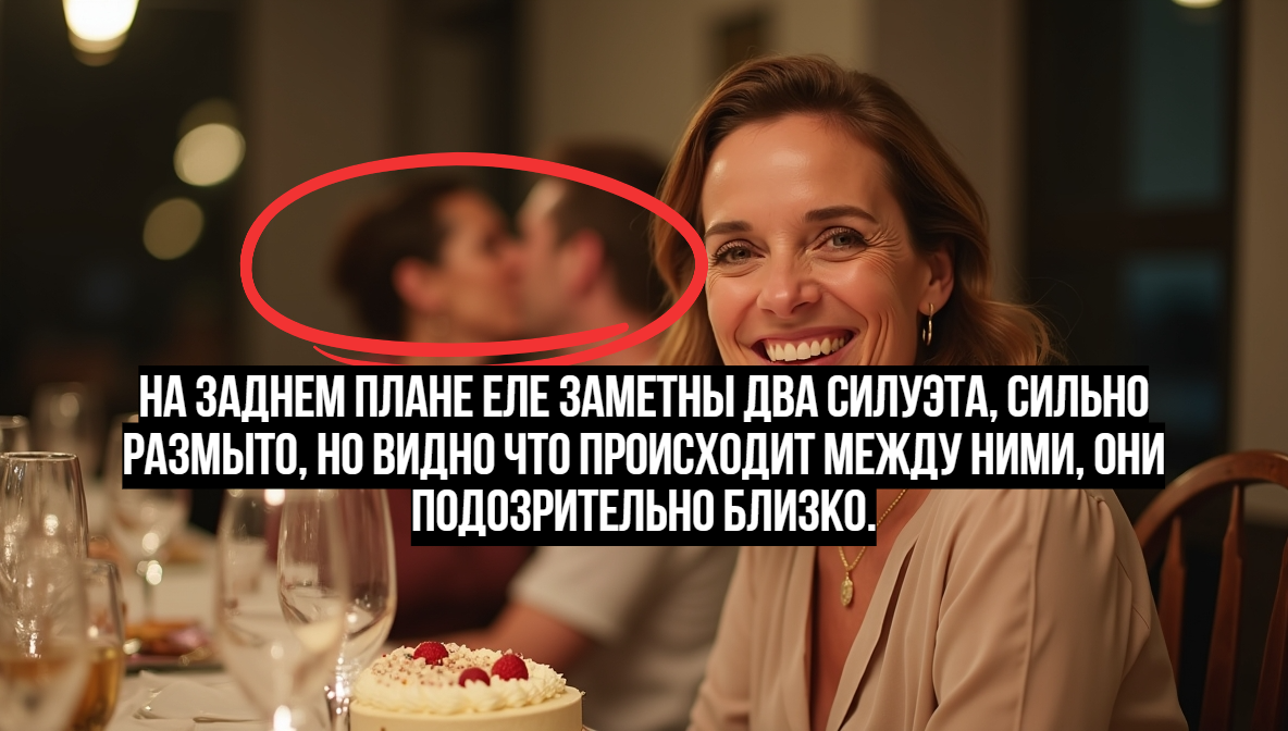 Там — ещё фото. Подарки, торт, бокалы. Прошлогодняя именинница широко улыбается, но на заднем плане еле заметны два силуэта, сильно размыто, но видно что происходит между ними, они подозрительно близко.