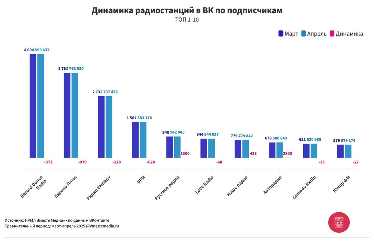 РАДИО ВКонтакте. Динамика радиостанций по подписчикам (Март - апрель 2025) В VK-Сообществах cтабильно успешны музыкальные радиостанции, удерживающие лидерство в социальной сети и не меняющие свои позиции с 2023 года. ➡️ Авторадио (680 843) — лидер по приросту подписчиков за апрель 📈+2 800 ➡️ Неизменный лидер рейтинга — Record Dance Radio с аудиторией 4 599 637 подписчиков. Отток аудитории за апрель составил 📉- 373 ➡️ Европа Плюс с аудиторией 3 763 930 (📉- 979) сохраняет 2-е место рейтинга ➡️ Радио ENERGY и DFM остаются на местах рейтинга и входят в топ-5, несмотря на небольшое снижение аудитории ➡️ Новое радио, Русское Радио и Радио MAXIMUM привлекли в отчетный период > 1к подписчиков В Топ-5 лидеров по числу подписчиков входят: 1. Record Dance Radio — 4 599 637 📉- 373 2. Европа Плюс — 3 763 930 📉- 979 3. Радио ENERGY — 2 737 475 📉- 228 4. DFM — 1 583 178 📉- 628 5. Русское радио — 942 045 📈+1 360 Топ-5 по приросту подписчиков: 1. Авторадио 📈+2 800 2. Новое радио 📈+1 712 3.