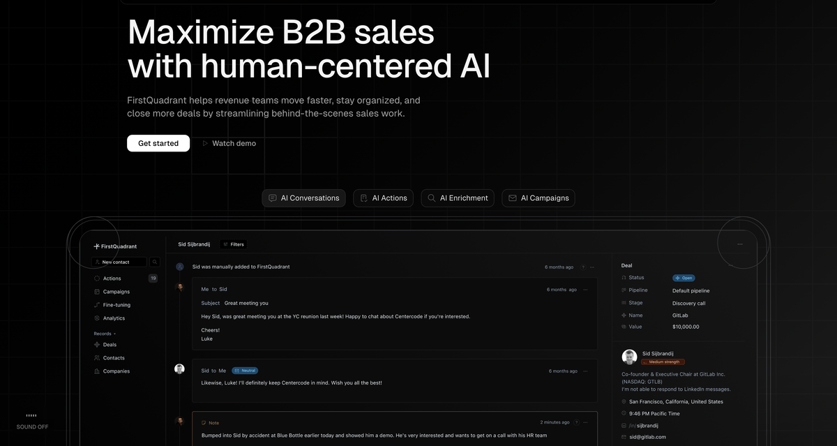 FirstQuadrant позиционируется как интеллектуальная платформа, созданная для автоматизации рутинных, но критически важных процессов в B2B-продажах с помощью искусственного интеллекта. Важный момент: разработчики сознательно уходят от популярной концепции "AI-агента", который стремится полностью заменить человека. Их философия – это "человеко-центричный ИИ". Идея в том, что ИИ должен работать как умный и проактивный ассистент, который усиливает команду продаж, освобождая людей для задач, где действительно нужен человеческий опыт и эмпатия, а не заменяя их.