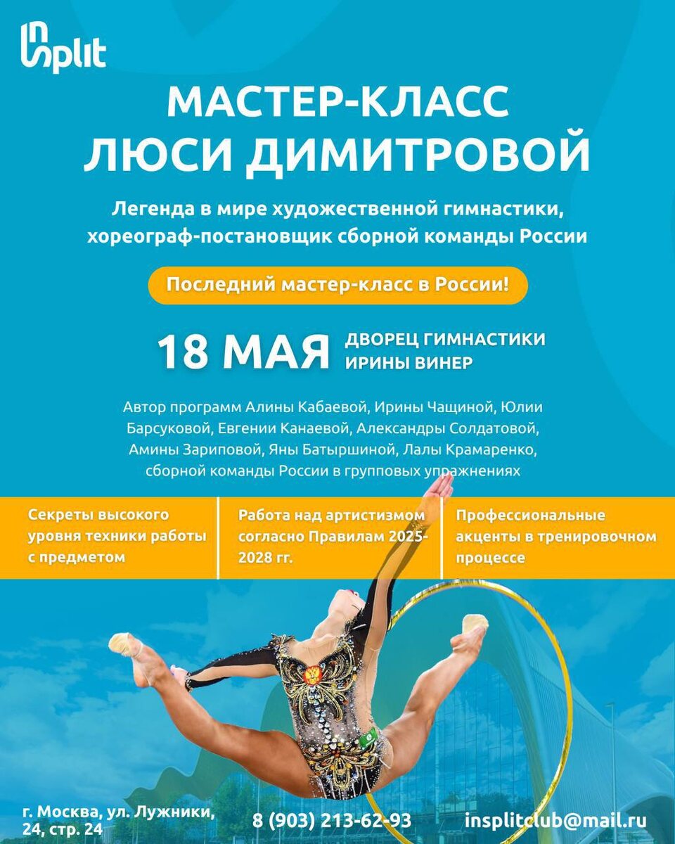 Мастер-класс от легенды в мире художественной гимнастики, хореографа-постановщика сборной команды России Люси Димитровой🥇 🔥Осталось всего 10 мест! 📆Дата: 18 мая 2025 г. с 10:00 до 15:00 📍Место проведения: Дворец гимнастики Ирины Винер, Олимпийский комплекс «Лужники» 🔥Последний мастер-класс Люси Димитровой в России! Возможность перенять знания и опыт эксперта, который более 30 лет работал со сборной командой России, а также с командами Болгарии, Испании, Канады! Автор программ Алины Кабаевой, Ирины Чащиной, Юлии Барсуковой, Евгении Канаевой, Александры Солдатовой, Амины Зариповой, Яны Батыршиной, Лалы Крамаренко, сборной команды России в групповых упражнениях. 🔸 Секреты высокого уровня техники работы с предметом, изящества и красоты композиций 🔸 Работа над артистизмом согласно правилам 2025-2028 🔸В рамках мастер-класса будут затронуты индивидуальные и групповые программы 🔸Фото и автограф-сессия 📎ПОЛОЖЕНИЕ 🔥Не упустите свой шанс и успейте зарегистрироваться на мастер-к