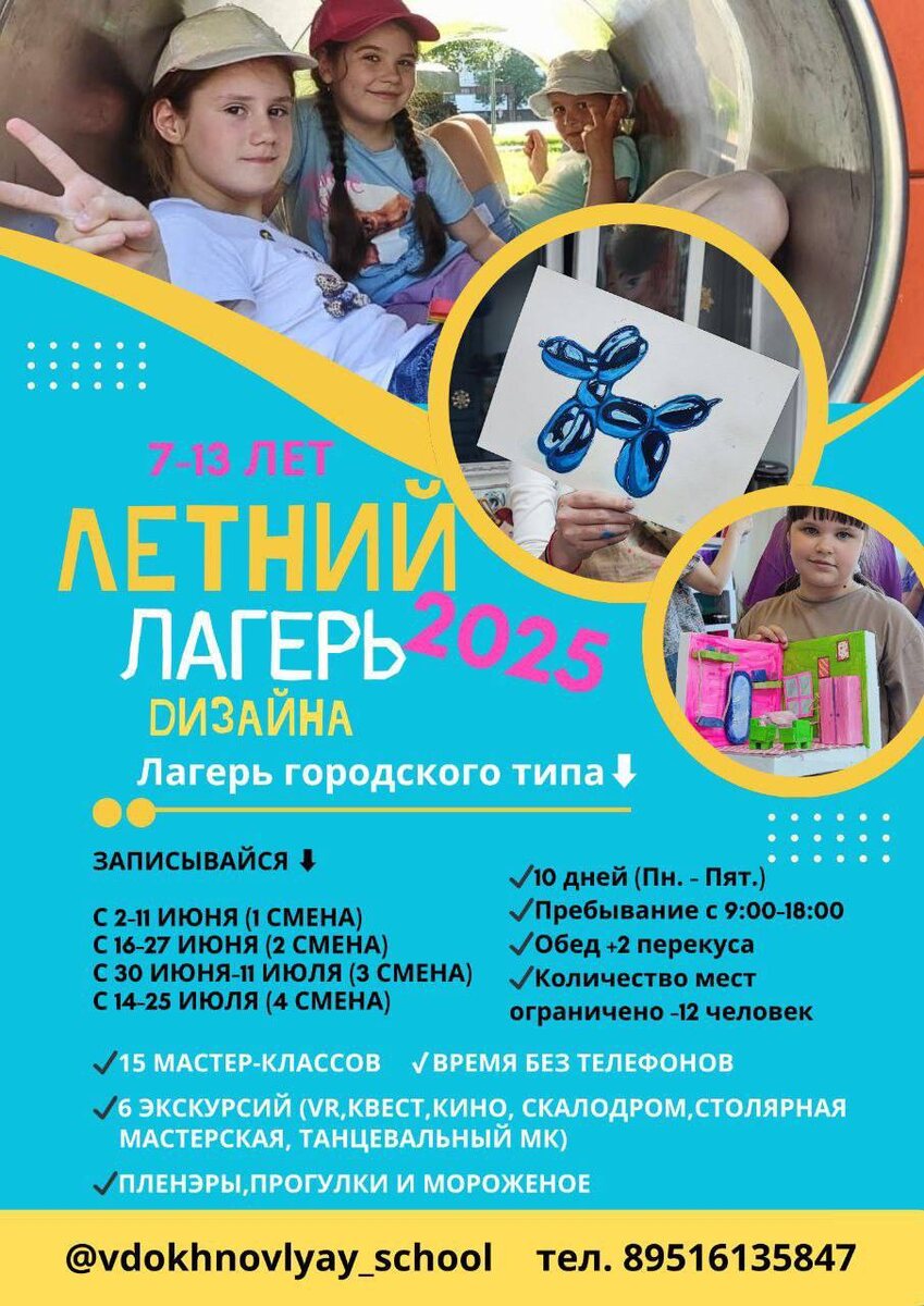 Выбирай подходящую смену и ЗАПИСЫВАЙСЯ ⬇️ С 2-11 июня (1 смена) С 16-27 июня (2 смена) С 30 июня- 11 июля (3 смена) С 14-25 июля (4 смена) ☀️Ребята попробуют 4 направления в дизайне Дизайнер интерьера Фешин дизайн Иллюстрация Декоратор ✔️15 мастер-классов 🌈макет магазина /кафе 🌈создадут кофемашину и сладости 🌈распишем школьный пенал в своем стиле 🌈отрисуем и собирем мини-книгу по мотивам мультика «Головоломка» 🌈 задекорируют ключницу и зеркало 🌈наклейки, табалапки и сквиши. ✔️6 экскурсии (кино, квест, vr, скалодром, столярная мастерская, танцевальный мк) ✔️пленэры,прогулки и мороженое. Описание⬇️ ✔️ 10 дней (Пн. - Пят.) ✔️Пребывание с 9:00-18:00 ✔️Обед +2 перекуса (завтрак/полдник) ✔️Количество мест ограничено -12 человек Стоимость⬇️ Тариф 1 (с питанием/ доставка) -24000 руб Тариф 2 (питание приносите свое) -19000. Разовое посещение- 2500 руб Записаться⬇️ ВДОХНОВЛЯЙ ART project /school⠀ пр-т Бардина 26 Офис. 903.⠀ тел. 89516135847 (администратор студии) Inst: https:/