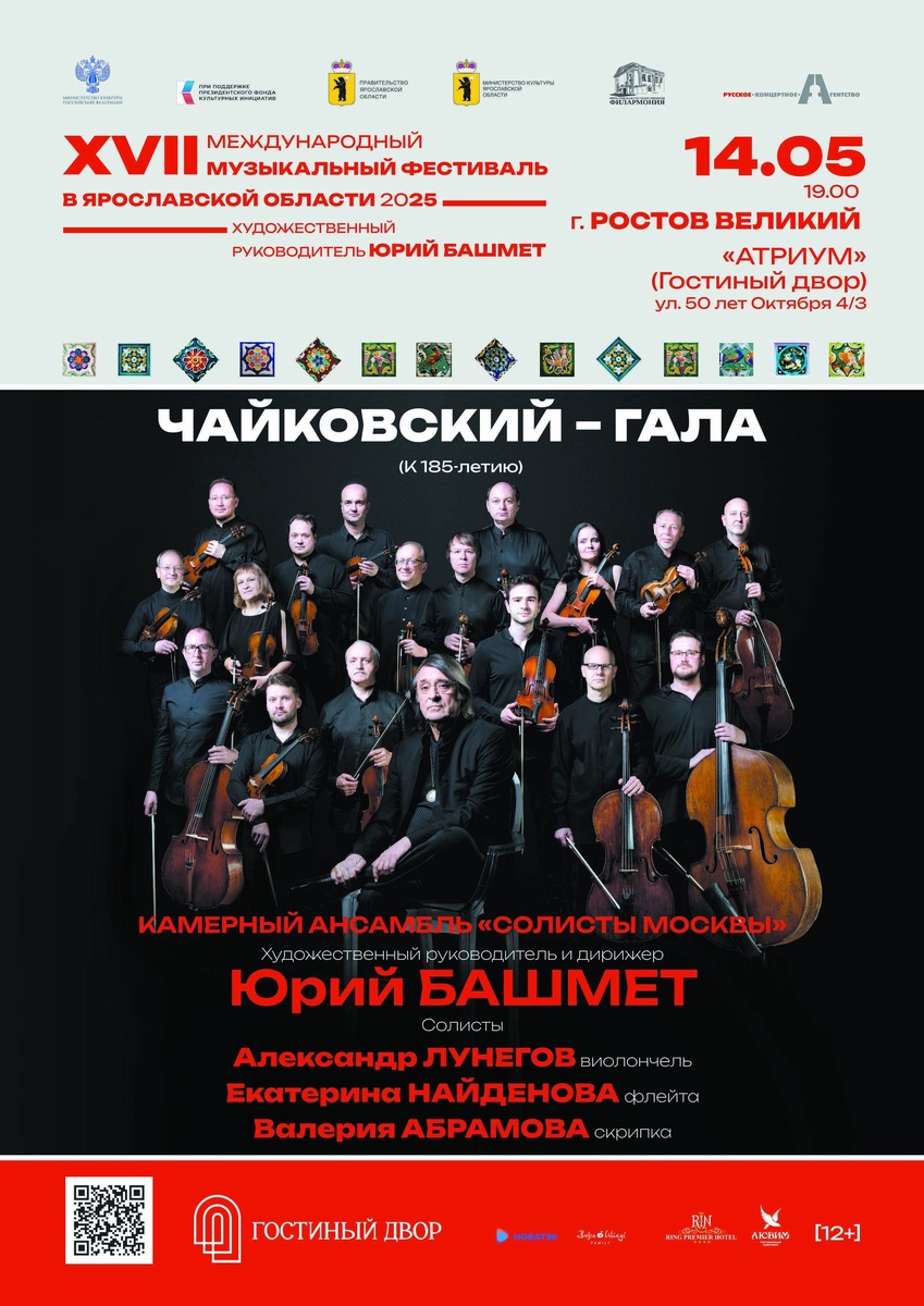 Дорогие слушатели приглашаем всех на концерты в рамках XVII Международный музыкальный фестиваль под артистическим руководством народного артиста СССР Юрия Башмета, которые пройдут не только в Ярославле, но и городах Ярославской области. Так, маэстро Башмет с «Солистами Москвы» 14 мая лично посетит Ростов Великий и 16 мая – Переславль-Залесский. А 15 мая серия камерных концертов в исполнении участников ансамбля «Солисты Москвы» пройдет в таких городах как Гаврилов-Ям и Углич, а также в поселке Некрасовское. 15 мая публике Рыбинска представят вечер романтических сонат для виолончели и фортепиано в исполнении народного артиста РФ, знаменитого виолончелиста современности Александра Князева и пианистки Ксении Башмет. В программе вечера – музыка Брамса и Штрауса. Добро пожаловать! Мы ВАМ рады!