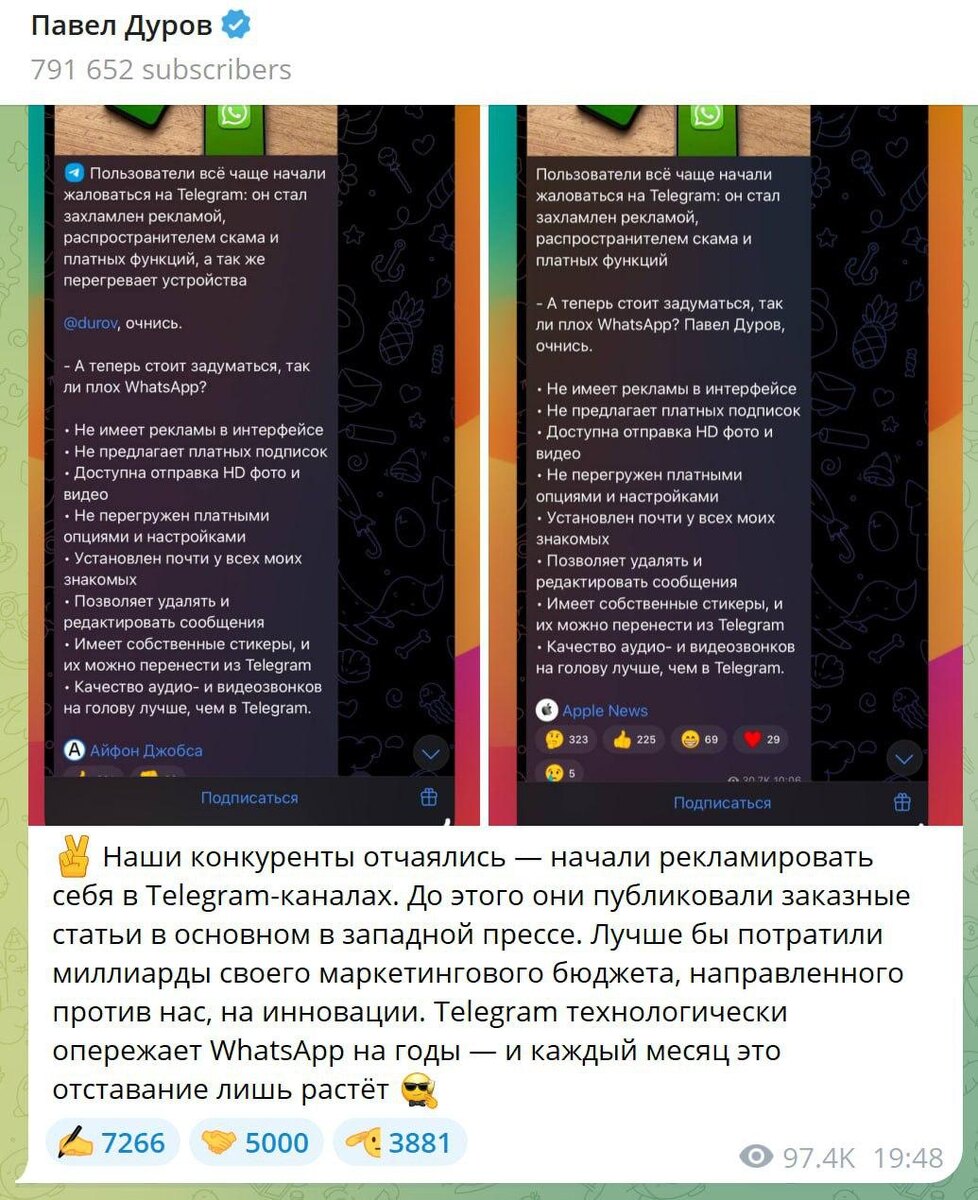 Действительно ли WhatsApp бьётся в отчаянных конвульсиях, пытаясь сохранить аудиторию? 👋Привет! На связи Стас Ягупов, основатель SMIT. Я думаю, вы уже увидели забавный пост Павла Дурова, в котором он высмеивает WhatsApp. В этот раз Павла Валерьевича задело, что представители «зелёного» мессенджера начали рекламироваться в Telegram через заказные посты. Дуров ругает их за то, что вместо инвестиций в инновации они вкладывают деньги в такой спорный маркетинг и резюмирует, что конкуренты «отчаялись». Но действительно ли у WhatsApp всё так плохо? Спойлер — нет. 📱 «Воцапом» регулярно пользуются свыше 2 миллиардов человек ежемесячно. 📱 Telegram используют лишь 1 миллиард человек. Отставание ровно в x2 раза. Однако повод для напряжения у руководства WhatsApp есть — с 2020 года аудитория мессенджера почти не выросла, упёршись во многом в естественный лимит (активных пользователей интернета в мире осталось не так много). Telegram же в свою очередь стремительно навёрстывает отставание,