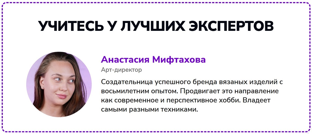 Курс Ведет - Анастасия Мифтахова. Создательница успешного бренда вязаных изделий с восьмилетним опытом. Продвигает это направление как современное и перспективное хобби. Владеет самыми разными техниками.