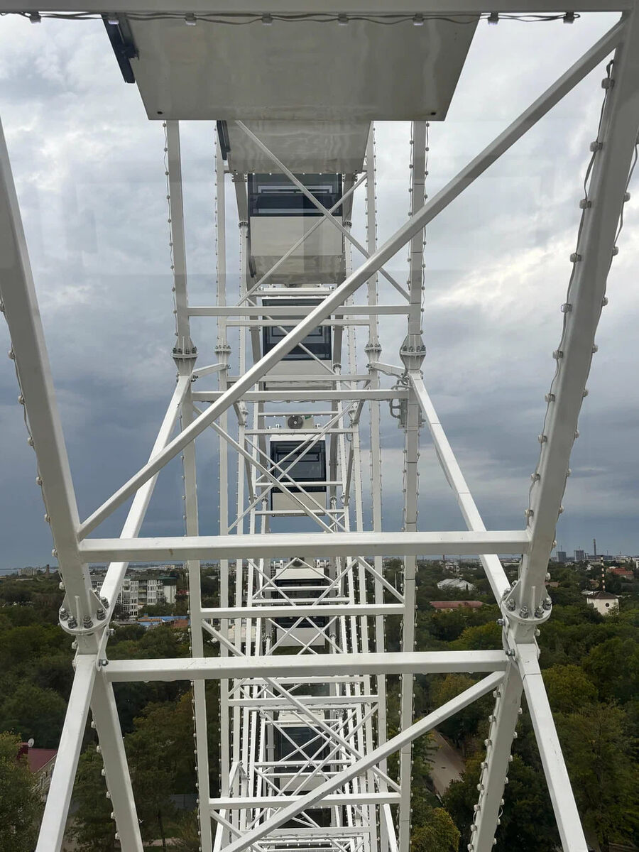 💥 Колесо обозрения на набережной Терешковой в Евпатории находится в сквере им. Караева, рядом с Каскадным фонтаном и заведением «Чебуреки». Вблизи также исторический Дом купца A.Ф. Панайотова. 🎡 На этом колесе обозрения предусмотрены современные кабины безопасной конструкции. Они оснащены кондиционерами, есть мягкие диваны для комфорта. На уровне роста человека над сиденьями есть открывающиеся окошки для фото. 👀 С колеса открывается панорама на море и район набережной Терешковой, а также на Старый город, где проходит основной евпаторийский экскурсионный маршрут, известный как «Малый Иерусалим». 🚗 Добраться до места можно, доехав на автобусе или трамвае №1 до остановки "Парк имени Караева". Она находится аккурат рядом с Колесом обозрения. На машине от центра города сюда проехать несложно так. 📌 набережная Терешковой 📍 45.194821, 33.376868 📸 Оксана Корень #аттракционы, #развлечения ✔️ Больше мест Крыма на нашем ТГ-канале