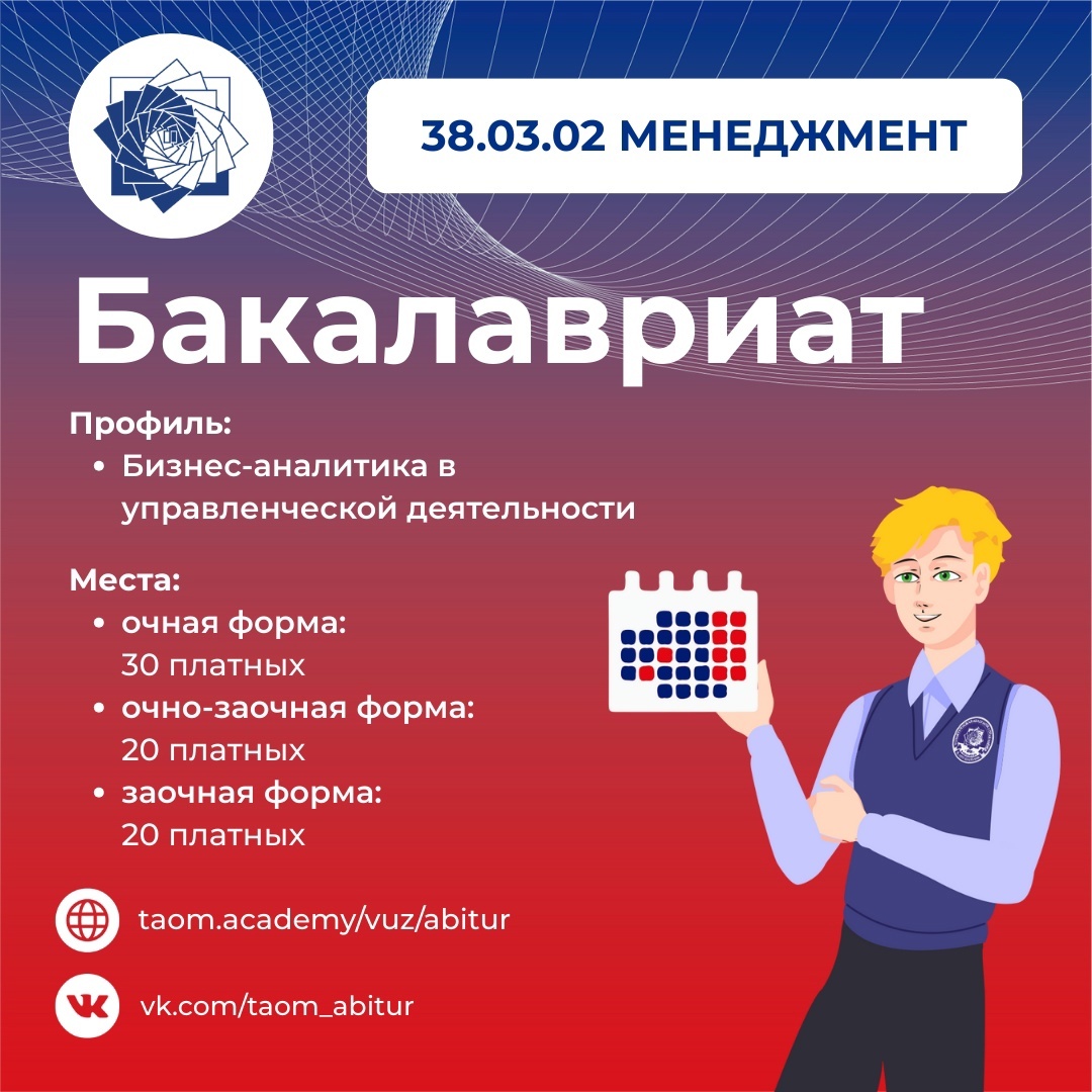 Мечтаете открыть свой бизнес, стать директором предприятия или успешным руководителем компании? В современном мире квалифицированные менеджеры – залог успеха любой компании. Направление подготовки «38.03.02 Менеджмент» в ТАУ готовит специалистов, способных эффективно управлять бизнесом и выстраивать оптимальные стратегии развития компании. Профиль подготовки «Бизнес-аналитика в управленческой деятельности» построен на практической подготовке, благодаря которой вы освоите современные технологии управленческого мышления, научитесь анализировать бизнес-процессы и успешно реализовывать бизнес-проекты. Поступайте в ТАУ и становитесь: директором предприятия или владельцем собственного бизнеса, менеджером по управлению процессами, бизнес-аналитиком, менеджером проектов, маркетинговым аналитиком. В 2025 году доступно 80 мест для поступления: Начните свой путь к успешной карьере руководителя вместе с ТАУ! Подробнее об условиях поступления: taom.academy/vuz/abitur. Ответим на ваши вопросы: Почт