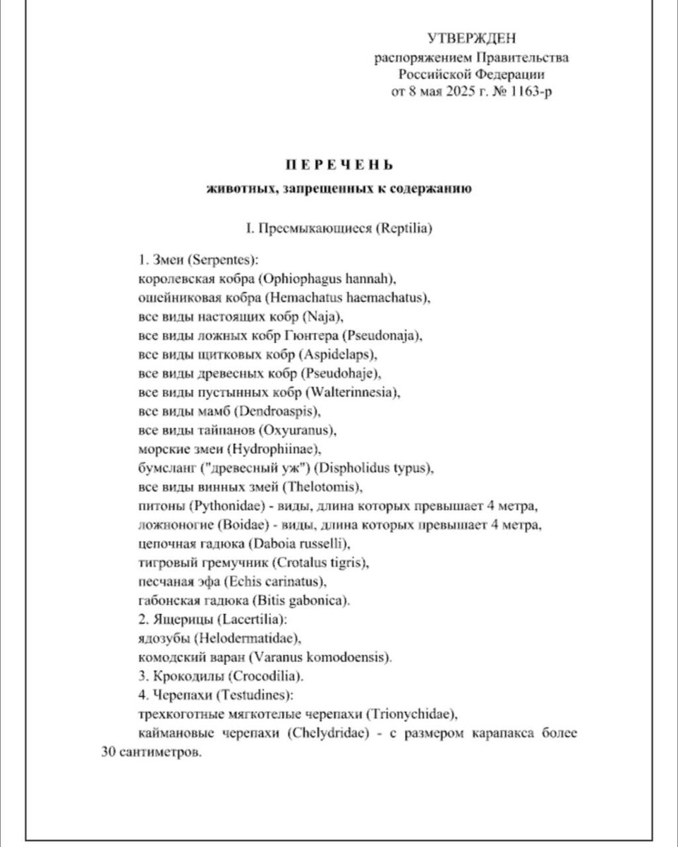 🐯Россиянам запретили держать экзотических животных дома Под запрет попали 121 разновидности животных, среди них различные виды змей (кобры, питоны), тигры, львы, гиены и приматы. Также в список попали пингвины и ядовитые пауки. Распоряжение вступит в силу с 1 сентября 2025 года и будет действовать шесть лет. ______ 🔴Оставить обращение ✏️ 🔴Подписывайтесь на 8 канал