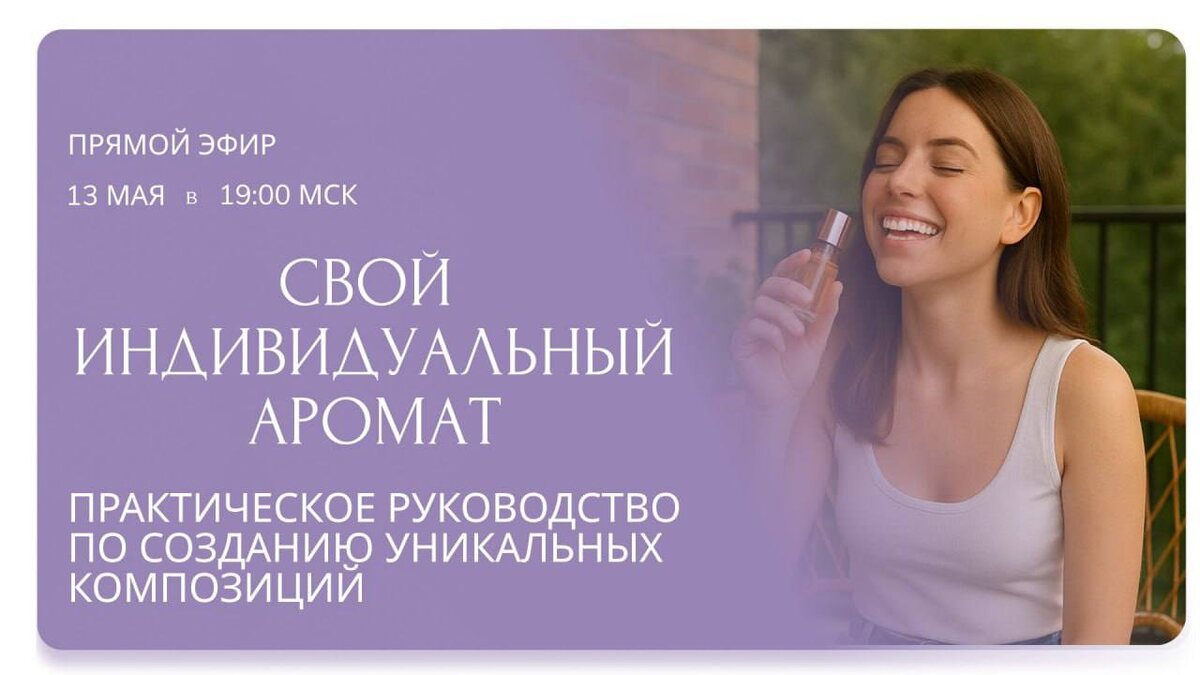 Ваш личный аромат как точка опоры. Уже сегодня вечером — встречаемся? Приветствую🙂 Мы всё чаще слышим: «хочу найти свой путь», «хочу быть собой», «хочу чувствовать, что я живая». А что, если путь к этому начнётся… с запаха? Сегодня вечером на эфире «Свой индивидуальный аромат: практическое руководство по созданию уникальных композиций» мы будем не просто говорить об ароматах. Мы будем воссоединяться с собой — через запахи, эмоции, тело и глубинные смыслы. Вы узнаете: – Как создавать свои уникальные ароматические композиции, которые работают не просто «на запах», а как система психологической настройки – Почему у одних эфирных масел «включаются» одни состояния, а у других — совершенно противоположные – Как соединять ароматы так, чтобы они помогали вам справляться с тревогой, апатией, перееданием, утратой вдохновения или паникой – Что такое ароматическая память и как использовать её в терапии, в быту, в самопомощи – И главное: как через аромат вернуть себе радость, устойчивость и в