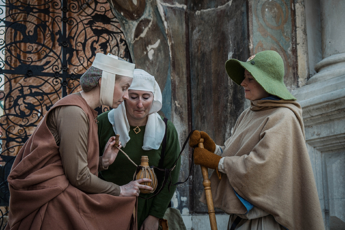 Одна из важных картин повседневной жизни средневековья - встреча в городах и на дорогах паломников/пилигримов. Паломничество это путешествие верующих к географическим местностям и реликвиям, имеющим сакральное значение. Богомольца, совершающего такое путешествие, называют пало́мником или пилигри́мом. И на улицах нашего фестиваля каждый год вы можете встретить таких странников, расспросить о путешествиях и тяготах пути, узнать про места дальние, что те видели своими глазами. "Слово "pilgrimage" ("паломничество") происходит от старофранцузского "pelegrinage", латинского "peregrinatio", и означает путешествие в священное место для религиозного поклонения. Основная идея христианского паломничества заключена в идее того, что Бог проявляет свои чудеса в разных священных местах и религиозных зданиях, которые можно посетить, демонстрируя и поддерживая свою веру. Каждый христианин в средневековье стремился совершить паломничество к какой-то святыне или священному место, во многом так же, как в