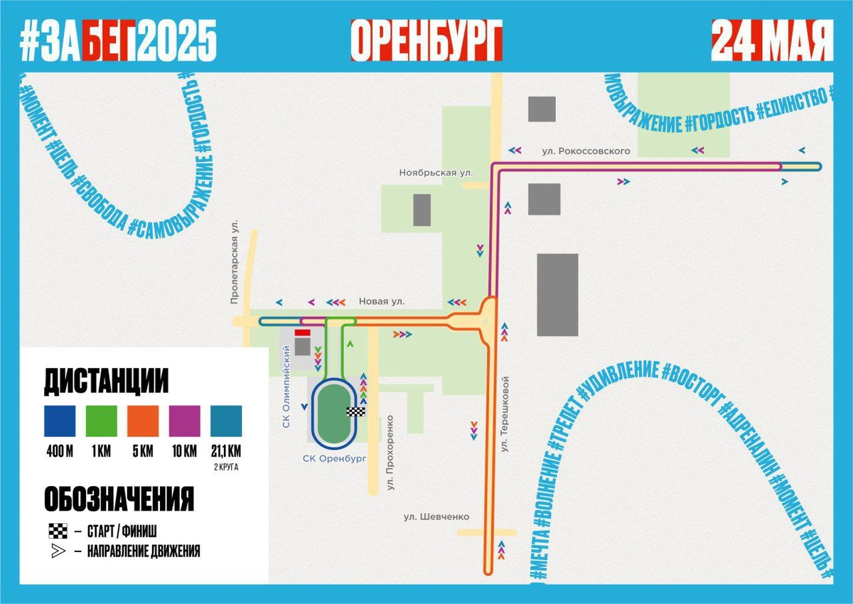 24 мая Оренбург примет участие во Всероссийском полумарафоне «ЗаБег.РФ». Спортивный праздник пройдет в 89 городах России, включая Оренбург. Старт забега состоится по адресу: ул. Новая, 17/1 (стадион «Оренбург»). Участников ждут дистанции: 21 км, 10 км, 5 км, 1 км и детские забеги на 500 м. Каждый получит стартовый пакет с номером, фирменной экипировкой, чипом для учета времени и медалью на финише. Полумарафон станет пятым событием проекта «Спортивный актив Оренбуржья». Для участия нужно отсканировать QR-код через приложение «Активный гражданин Оренбургской области» во вкладке «Я шагаю». С 06:00 до 14:30 24 мая будет ограничено движение транспорта на улицах: ⛔️ Прохоренко; ⛔️ Новая (от Пролетарской до Терешковой); ⛔️ дублер ул. Терешковой; ⛔️ Терешковой (от Хабаровской до Новгородской); ⛔️ Рокоссовского. Информация о движении общественного транспорта будет сообщена позже. Администрация города просит жителей заранее планировать маршруты.