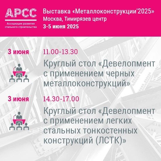 📣📣📣В первый день выставки «Металлоконструкции 2025», 3 июня 2025, на конференц-площадке 2 Ассоциация проведет два круглых стола с участием экспертов АРСС и представителей профессионального сообщества. 📍Круглые столы откроет Генеральный директор АРСС Александр Николаевич Данилов, который выступит со вступительным словом. 🔸 3 июня в 11.00-13.30 пройдет круглый стол «Девелопмент с применением черных металлоконструкций». 👨💻Модератор – руководитель направления по взаимодействию с отраслью АРСС, Максим Химченко. Программа круглого стола и регистрация 🔹 3 июня в 14.30-17.00 пройдет круглый стол «Девелопмент с применением легких стальных тонкостенных конструкций (ЛСТК)». 👤Модератор – эксперт АРСС Татьяна Назмеева. Программа круглого стола и регистрация ✅Подробнее