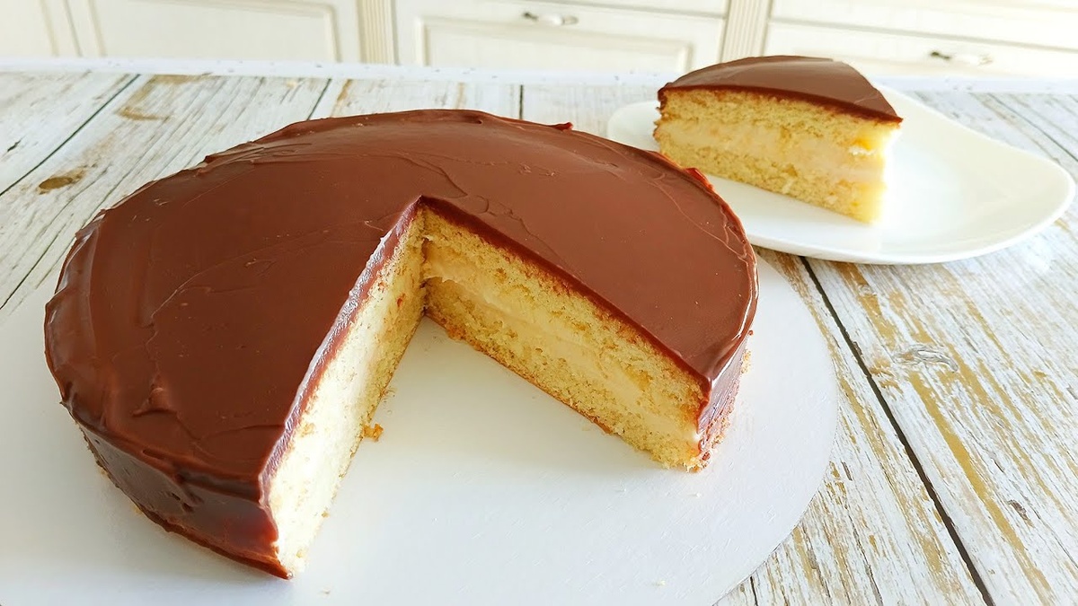 Закрываю торт бисквитным коржом срезом вниз.