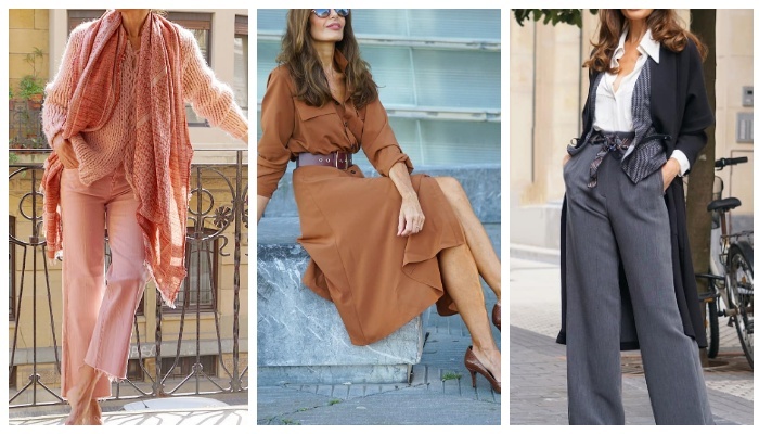 Прямо сейчас эксперты моды представят стильные и актуальные образы в классическом стиле, которые идеально подойдут женщинам старше 45 лет. Этот головокружительный образ в чёрно-белой гамме создан с помощью гармоничного сочетания вещей. В его основе — нежный вязаный свитер светлого оттенка. Жакет ему в контраст: он тоже светлый, но выделяется контрастными пуговицами. Этот верх дополняют чёрный ремень, кожаные брюки и остроносые ботильоны на высоком каблуке. Удачный и удобный образ для весенней поры дамам элегантного возраста поможет создать куртка-рубашка оттенка хаки. Её следует сочетать с классической рубашкой, брюками из кожи укороченного фасона и лакированными остроносыми туфлями на тонком каблуке. Изысканности и шарма добавят образу очки от солнца с тёмными стёклами и контрастной оправой. Кожаные кюлоты с высокой посадкой + принтованный пуловер + классические туфли-лодочки — минималистичный look, который обратит на себя внимание. Брюки классического фасона, а также модные варианты
