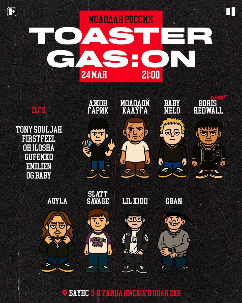GAS:ON x TOASTER 24 мая Открываем летний сезон большой тематической вечеринкой! «Молодая Россия» — не просто тусовка, а место, где рождается новая сцена Вас ждут: - 7 лайвов от самых актуальных молодых исполнителей - перфомансы и секретные гости - большая зона на открытом воздухе 🎫 Билеты в продаже По промокоду 24MAY скидка на билеты 15% FC/DC 18+ 📆 24 мая, в 21:00 📍 Баунс, Москва, 3-я ул. Ямского поля, 2к6