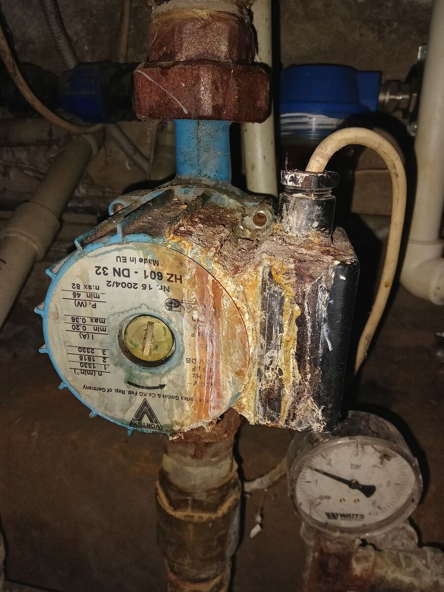 Попросили глянуть циркуляционный насос на систему отопления, т.ч. он не работал и нужен был вердикт, сгорел или нет. Стоял он вот так по дебильски, сверху на его ещё капало. Проверил питание, приходит. Включение в сеть показало, что признаки жизни он подаёт, но крутится отказывается. Тут как не много вариантов что с ним, заклинил, неисправный пусковой конденсатор, или накрылась обмотка. Хотя не уверен что он бы в этом случае гудел. Откручивание пробки на жопке не помогло, потому решил снять двигатель, для чего перекрыл воду, открутил 4 болта и.. и был озадачен тем, что из насоса начала хлестать вода. Благо сверху стоял ещё 1 вентиль. Получается тот вентиль что я закрыл, не держал от слова совсем. Вскрытие показало, что вал еле крутится. Видимо внутри набилось грязи. А пробку для прочистки никто никогда не откручивал. Она ведь не только воздух спускает, но и грязь через неё можно почистить. К сожалению ВДшки, Валеры и т.п. под рукой