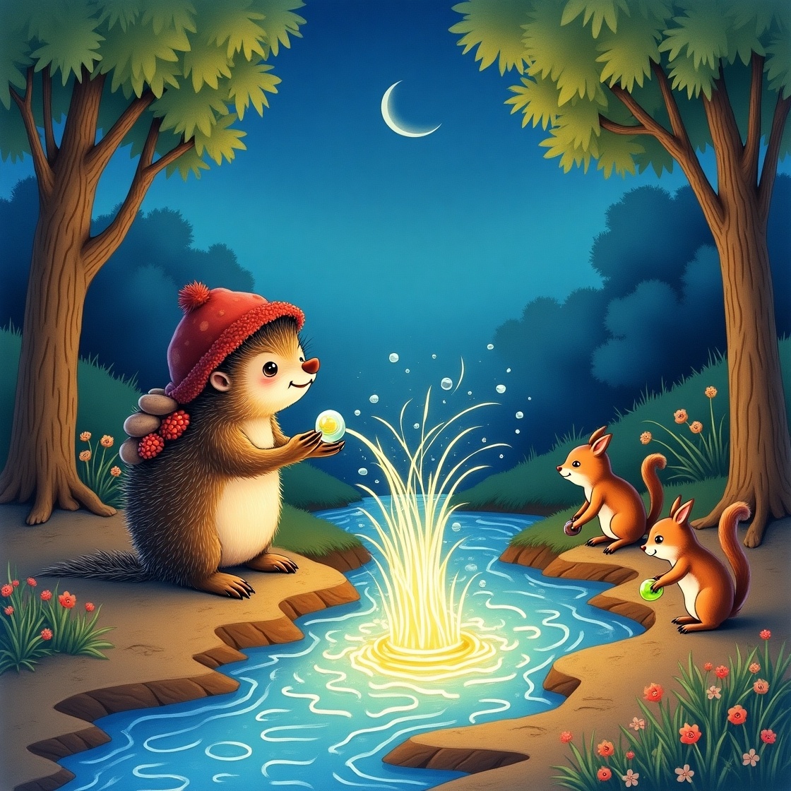 Но ёжик твёрдо нацепил на спину гриб-дождевик на случай дождя, запас черничных ягод и карту, нарисованную кротом Прохором (она заканчивалась на границе Леса Теней). Дорога оказалась непростой: В Лесу Шёпота деревья советовали вернуться, на Поляне Отражений ручей показывал картинки из прошлого, а у горы Ветров и вовсе пришлось свернуться в клубок и катиться, как мячику! Когда Колючик раскрылся, он увидел разбитый кувшин, а в нём... мерцающие камушки! Они светились, как светлячки, и журчали, как вода. — Это же Слёзы Луны! — вспомнил ёжик бабушкину сказку. — Они оживляют сухие родники! — Возьму-ка я их себе! – подумал Колючи