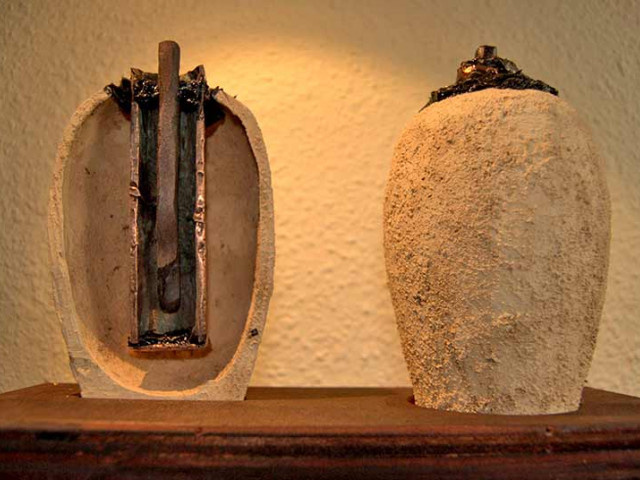 Это глиняный сосуд высотой около 13–15 см , запечатанный асфальтом. Внутри — медная трубка , а внутри неё — железный стержень , отделённый от меди восковой пробкой.