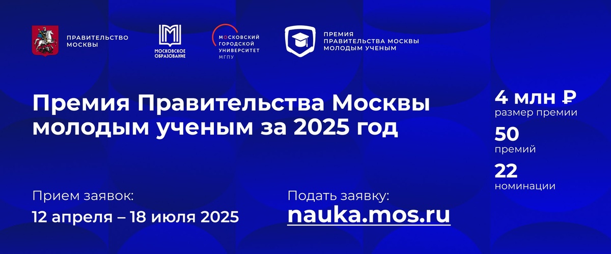 Открылся прием заявок на соискание премии Правительства Москвы молодым ученым за 2025 год. С этого года размер премий молодым ученым увеличен с 2 млн до 4 млн рублей. Всего присудят 50 премий. Участники представят проекты в 22 номинациях...