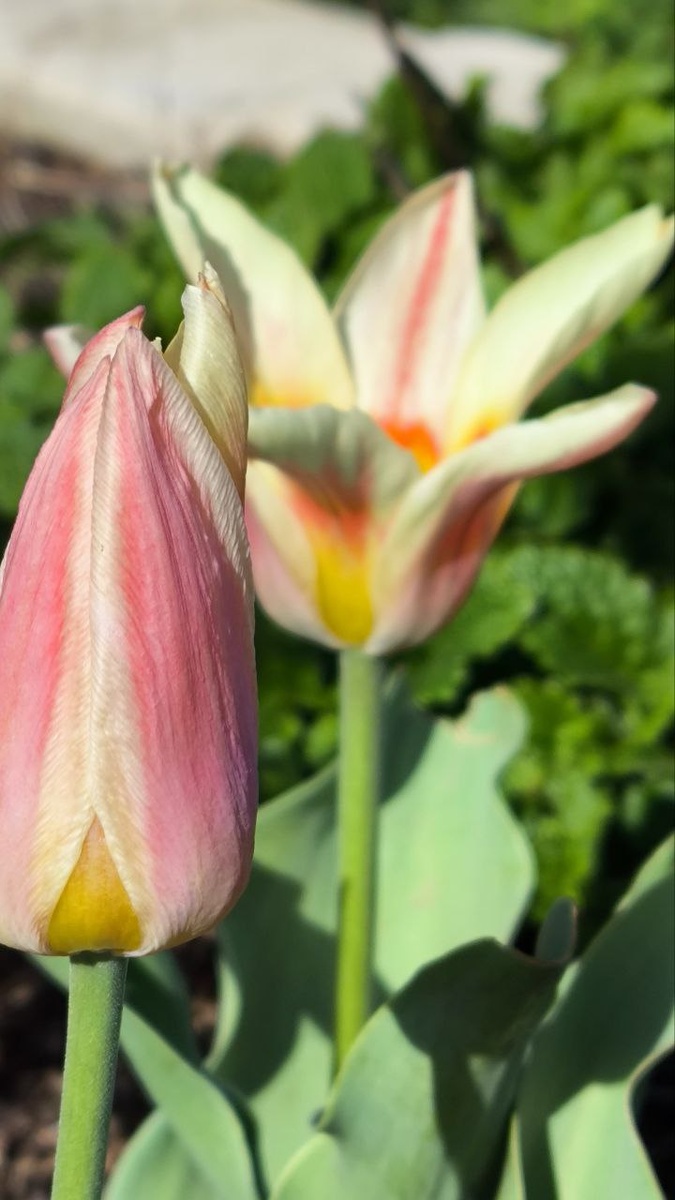 Если бы тюльпаны были парфюмами, 'Квебек' пах бы ванилью и утренней росой. Этот сорт — воплощение изысканной простоты, где каждая деталь продумана природой до мелочей. ✨ Почему 'Квебек' покорил мой сад? 1. Форма — классика с изюминкой Его бокал напоминает антикварный хрустальный бокал — такой же утончённый, с лёгким сужением кверху. Но в отличие от строгих сортов, 'Квебек' выглядит живым: плотные восковые лепестки слегка отгибаются наружу, когда цветок полностью раскрывается, будто предлагая полюбоваться своей красотой со всех сторон. 2. Окрас — нежность с характером Основной тон — кремово-розовый, как у спелого персика, присыпанного инеем. Но стоит солнцу коснуться лепестков, как проявляется золотисто-жёлтое основание — будто внутри цветка спрятано крошечное светило. К вечеру оттенок становится глубже, приобретая пыльно-розовые нотки. 3. Выносливость — танцует под дождём. 'Квебек' не разваливается после ливня. Его крепкие стебли выдерживают ветер, а лепестки сохраняют форму до
